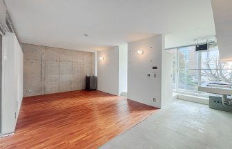バルコニーの外は人通りが少なく、グレー基調の室内と相まって落ち着きが感じられます。