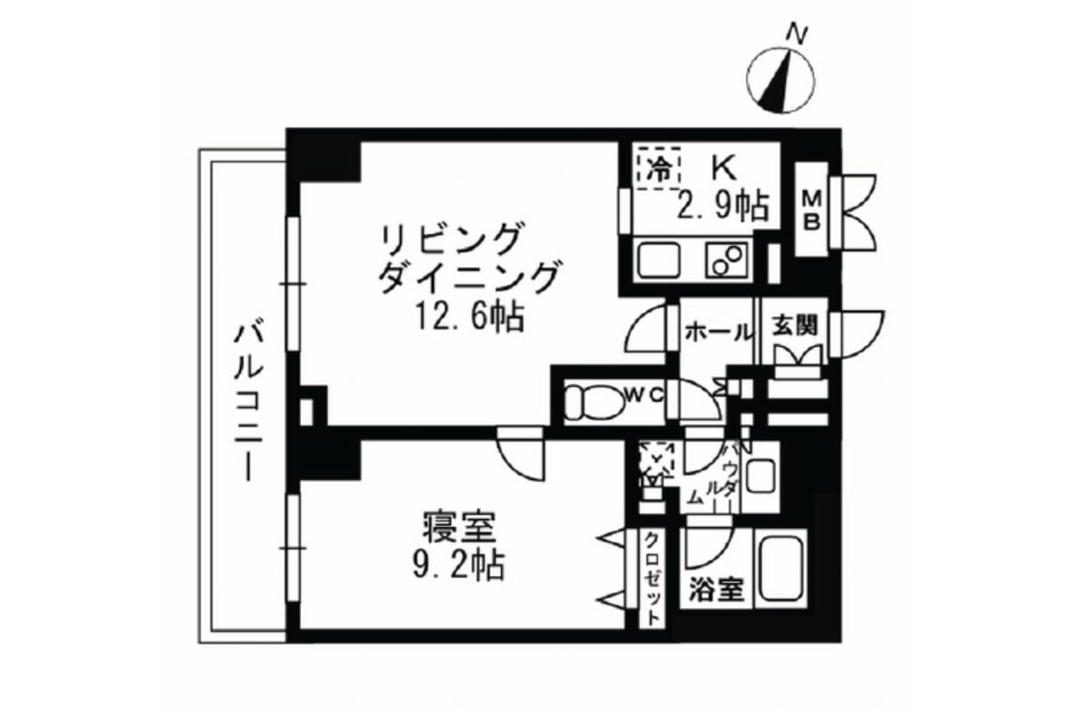 お部屋は4階、12.6帖のリビングダイニング+9.2帖の洋室の1LDK。