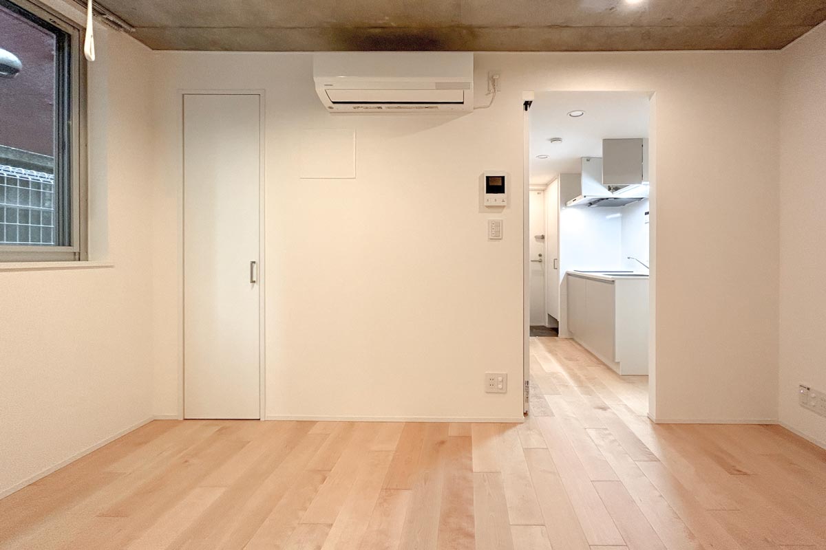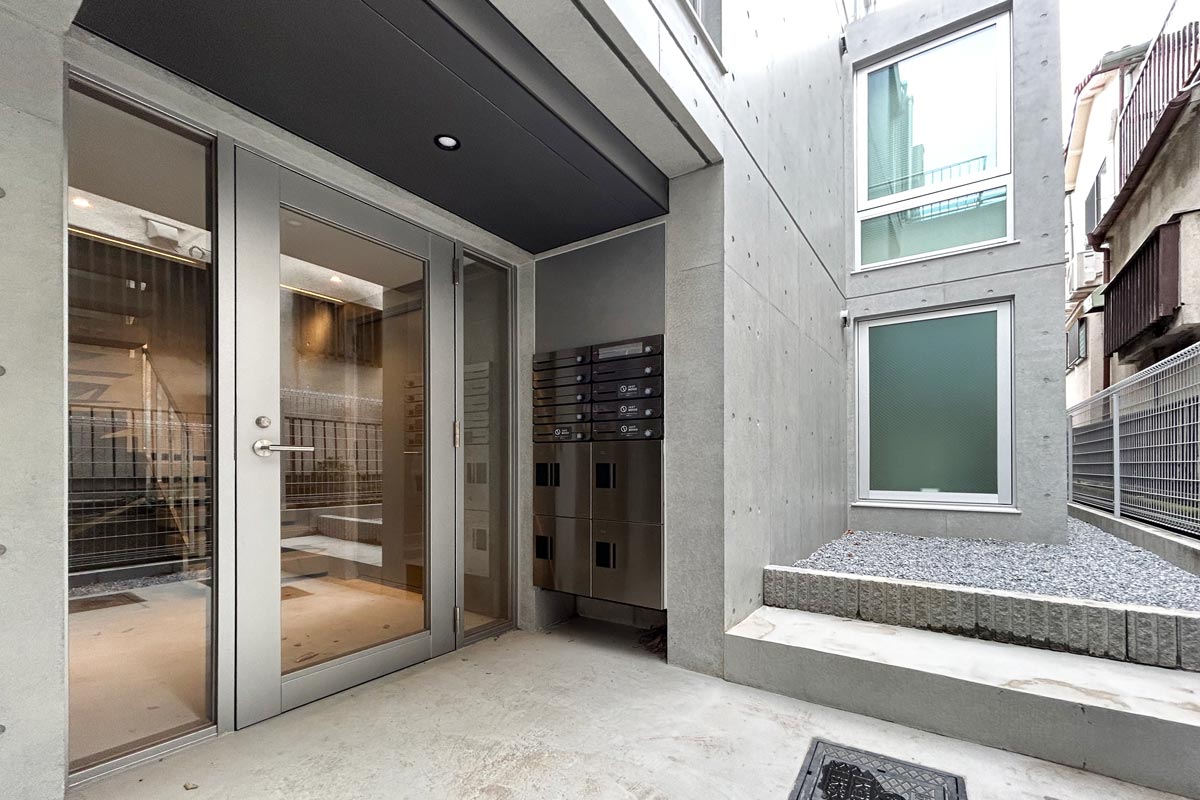 オートロックを開け、エントランスを入るとすぐに見える扉は、打ち放しの壁とのコントラストで、シンプルながらもデザイン性が高く、部屋番号すらスタイリッシュ。