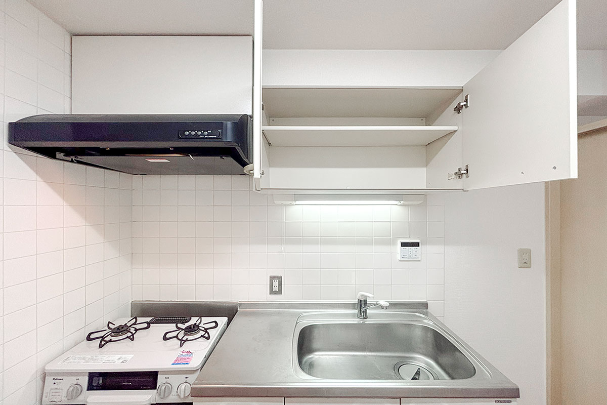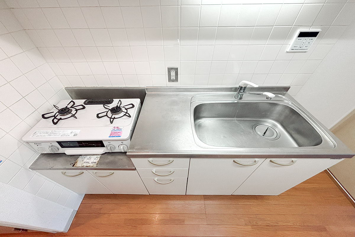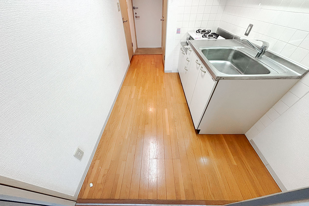 お部屋は2階の1K、8帖の居室に2口コンロのキッチン。