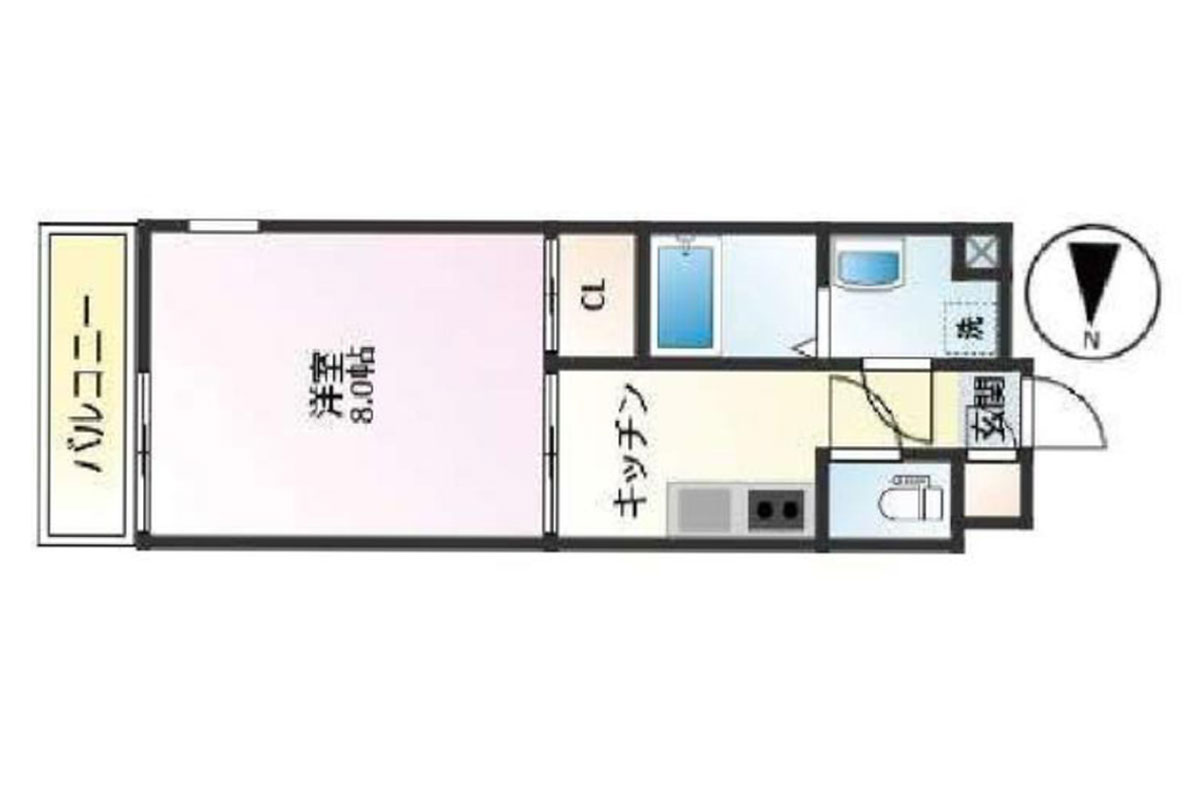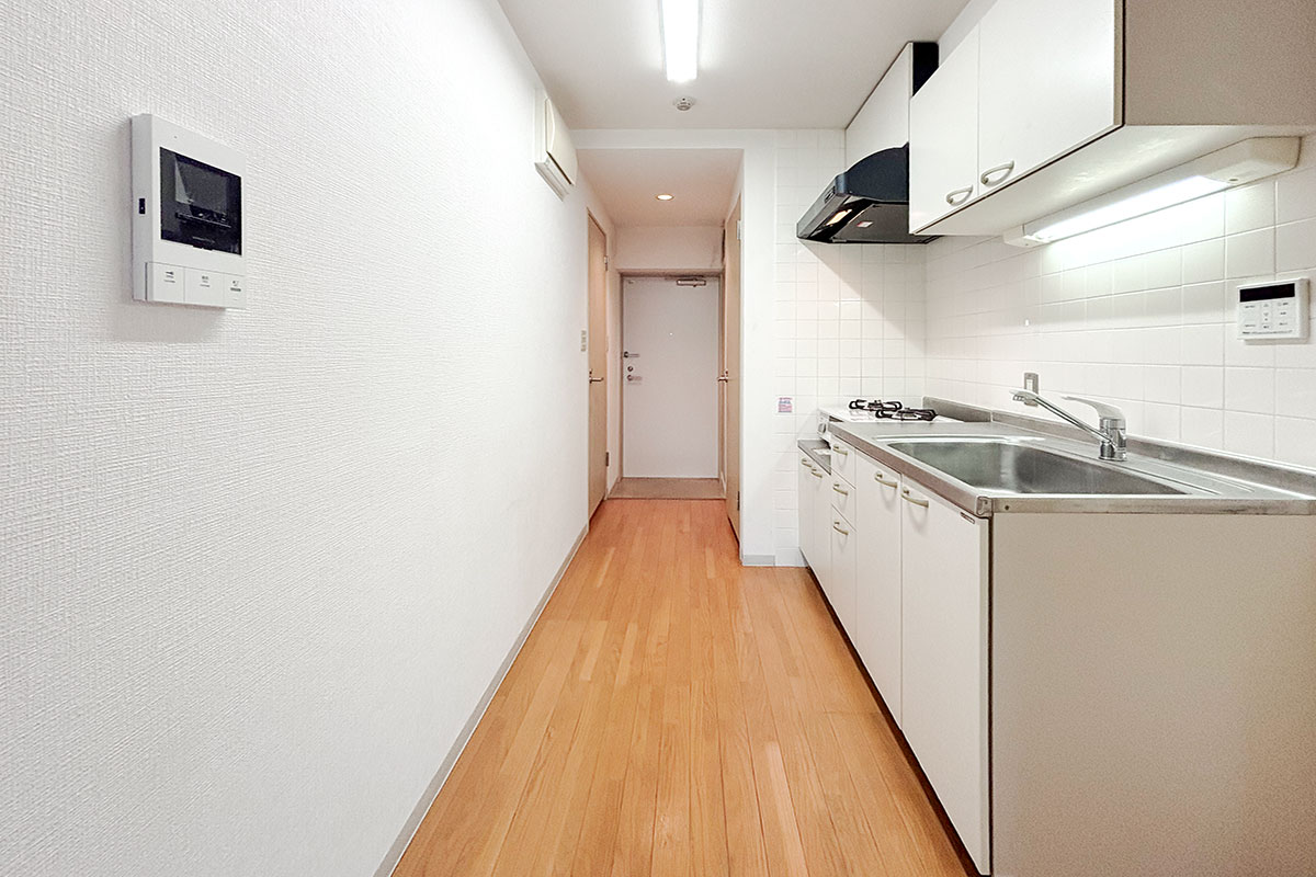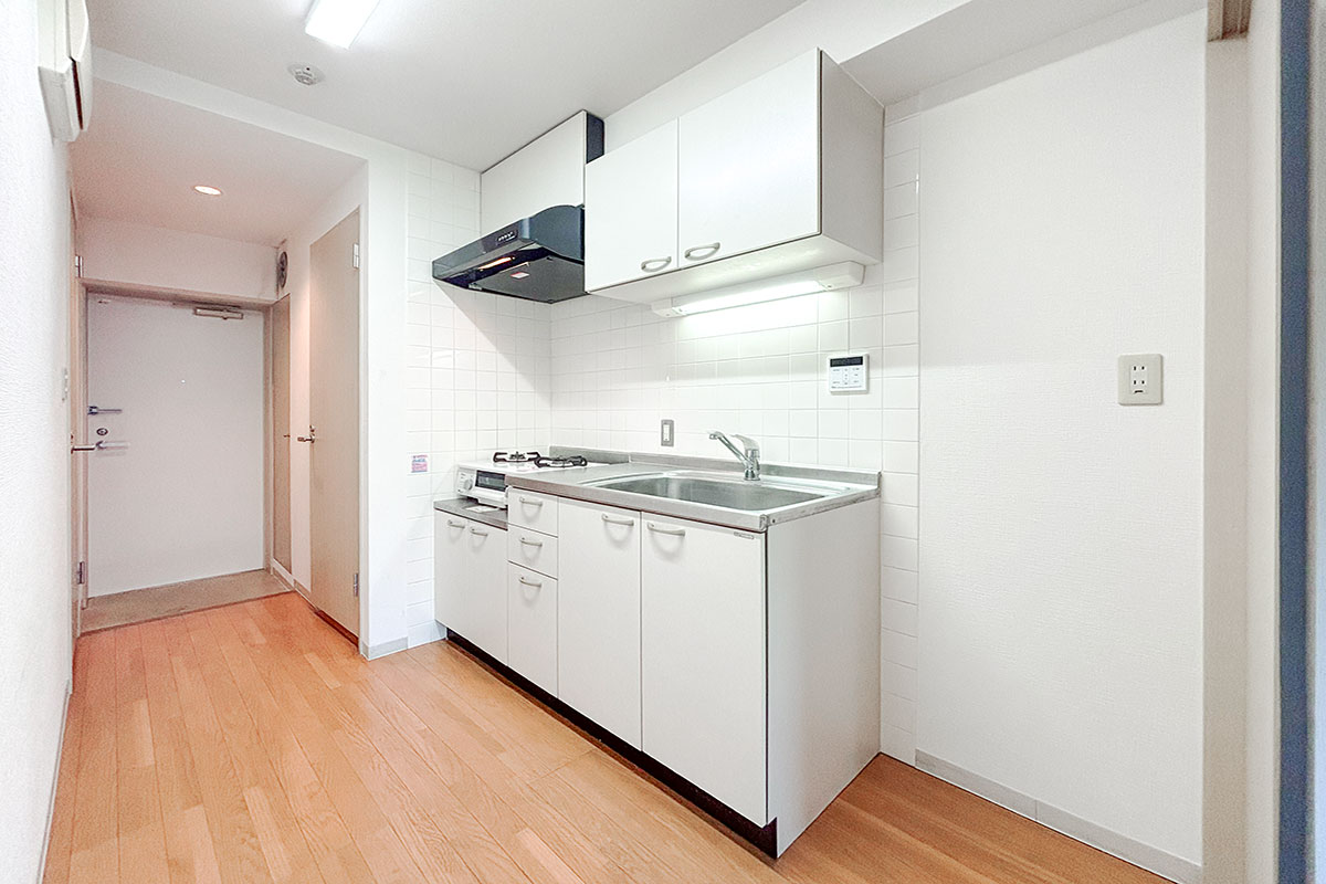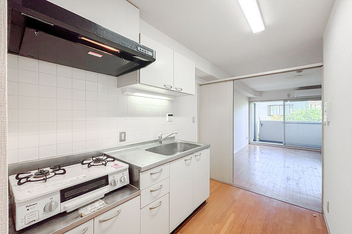 お部屋は2階の1K、8帖の居室に2口コンロのキッチン。