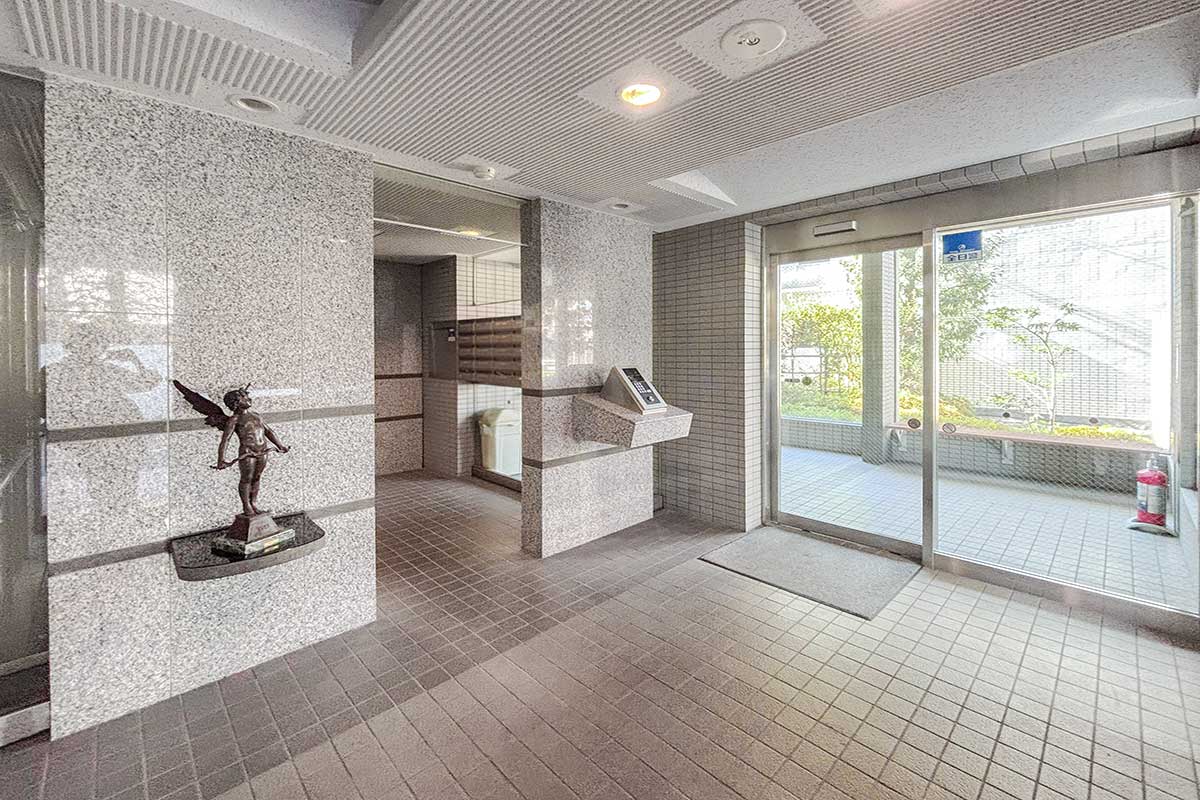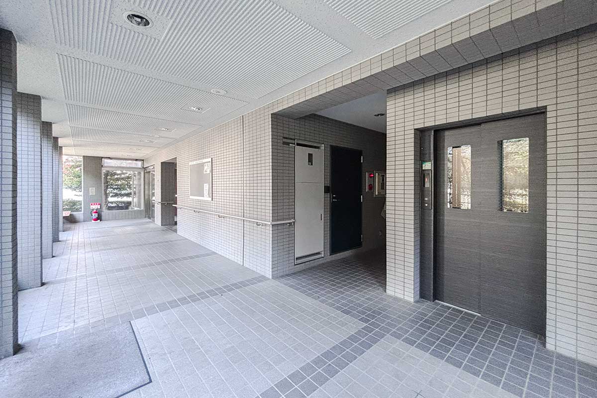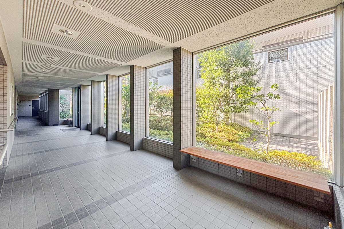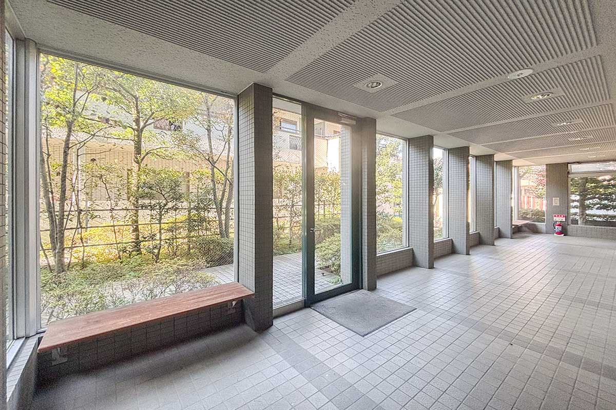 ゆとりあるエントランス越しに見える、敷地内の植栽が目にも鮮やか。