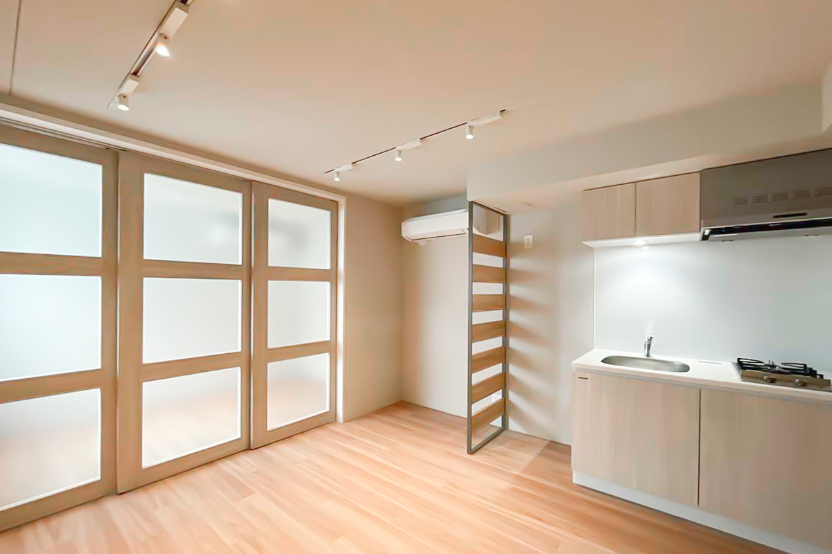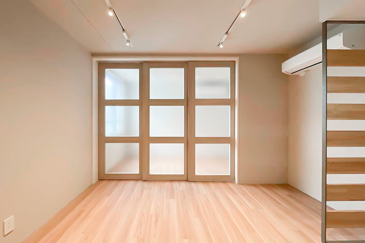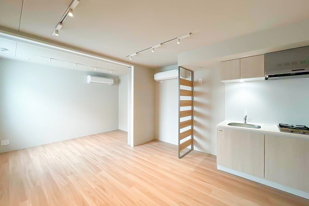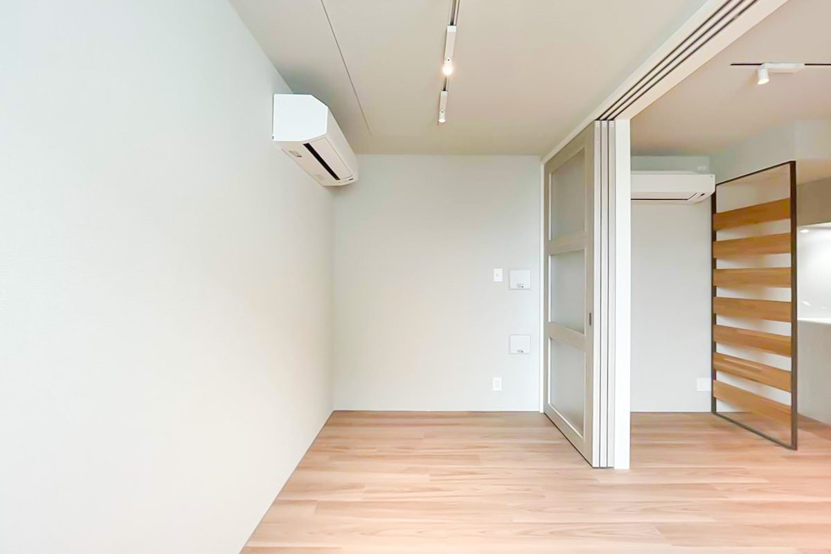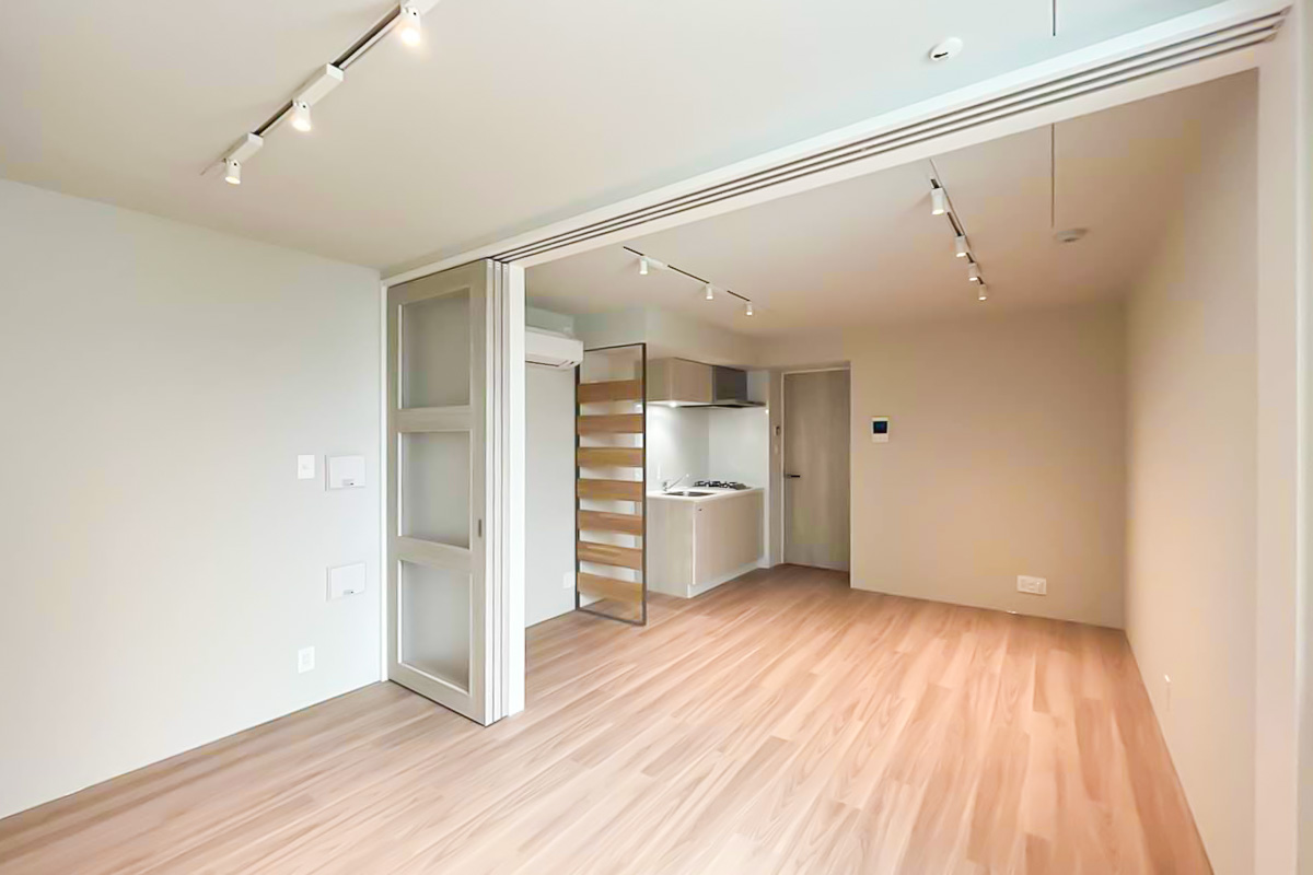 半透明なスライドドアを開け放てば、約11帖のワンルーム。スライドドアを閉めていてもほの明るい光は入ってきますが、DK自体には窓が無いので、日中はワンルーム使いが良さそう。