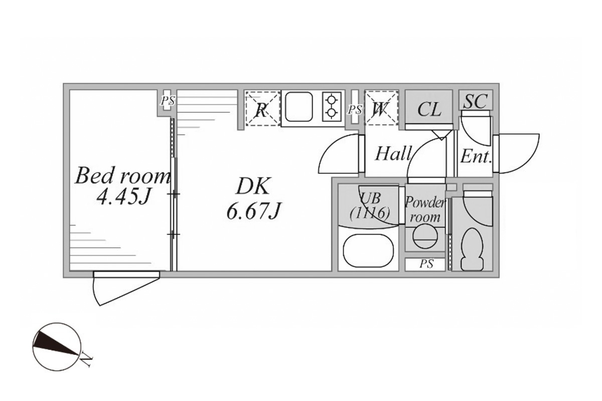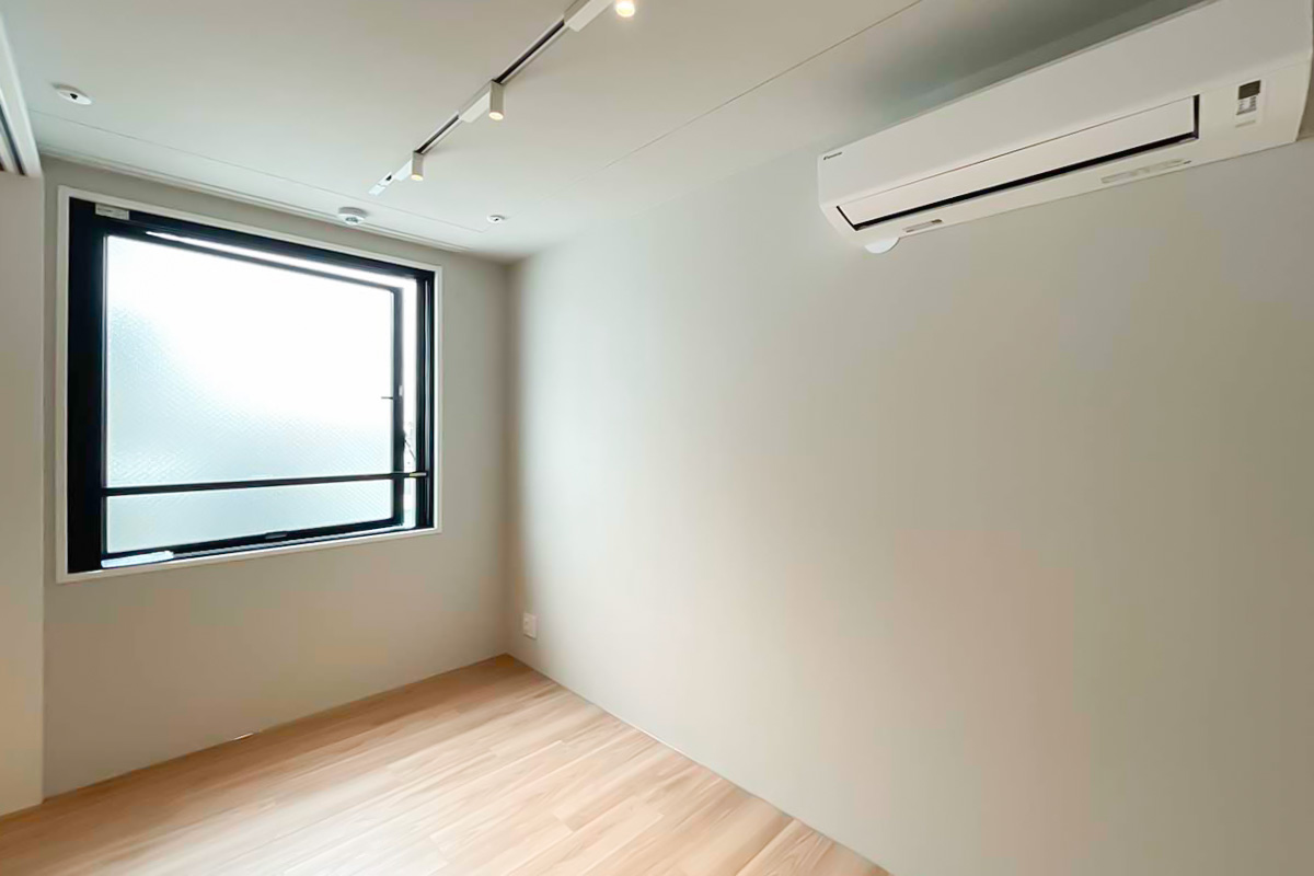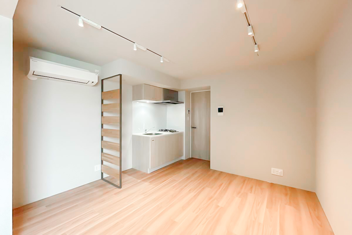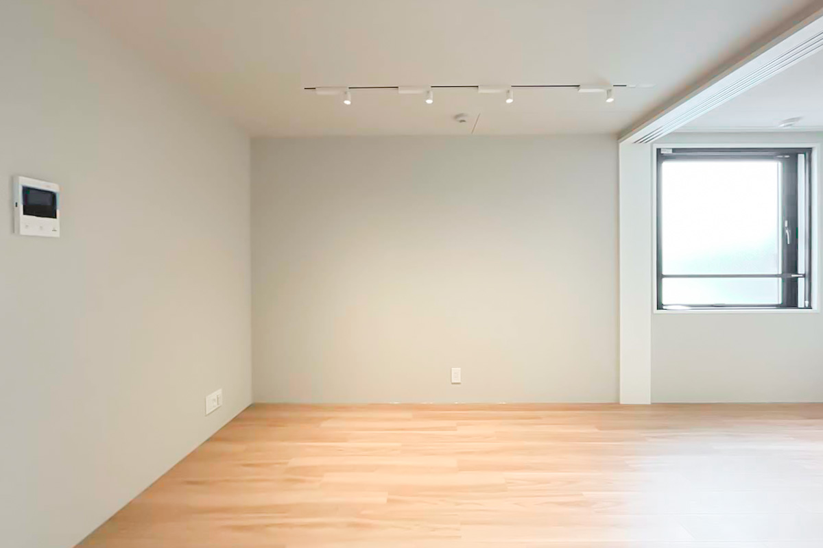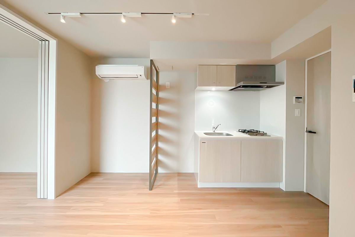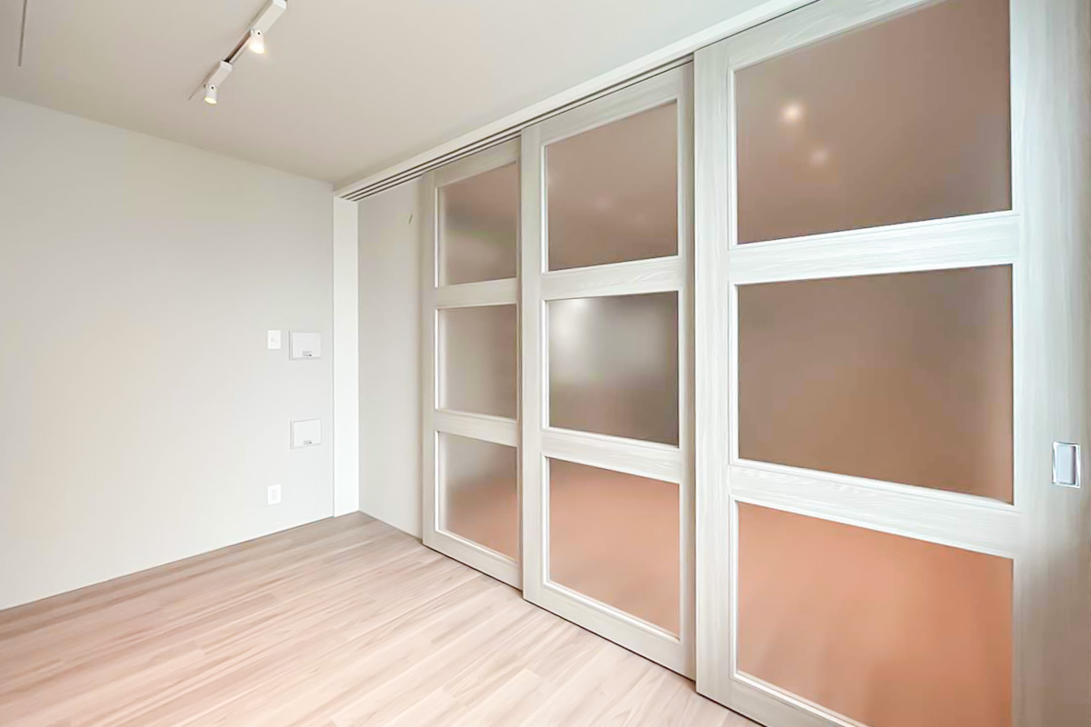 半透明なスライドドアを開け放てば、約11帖のワンルーム。スライドドアを閉めていてもほの明るい光は入ってきますが、DK自体には窓が無いので、日中はワンルーム使いが良さそう。