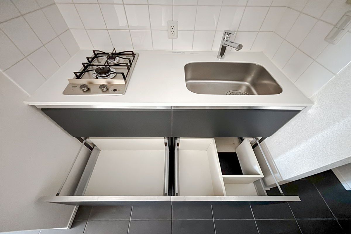 2口コンロで作業しやすく、調理器具がすっきりと納めやすい深型収納!