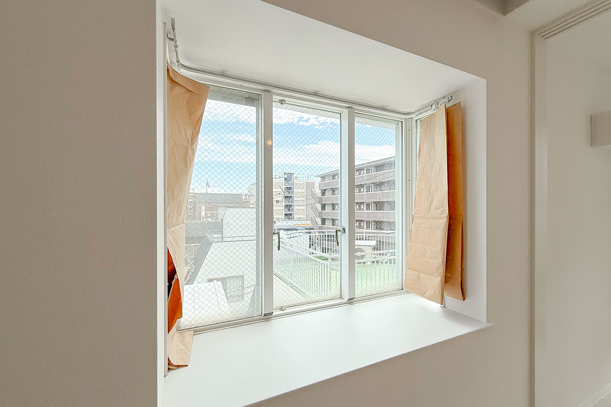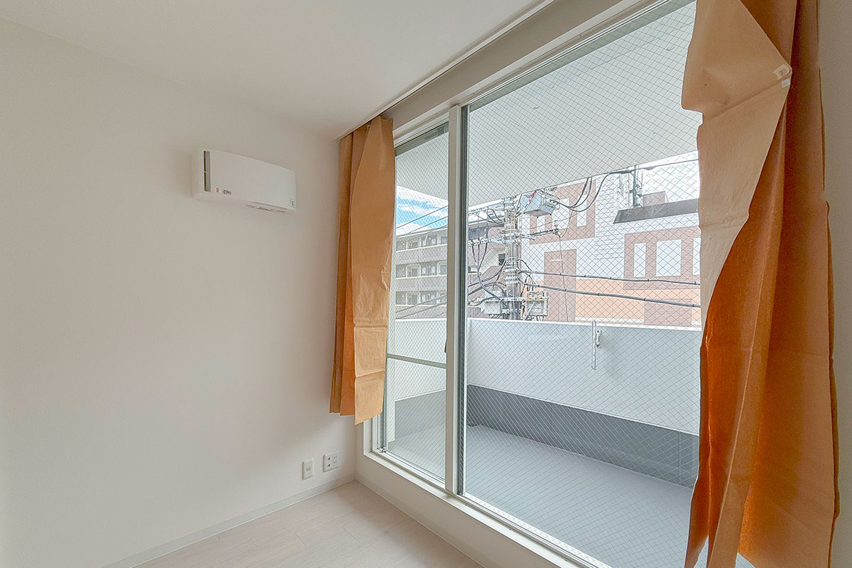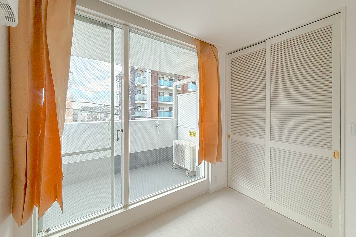 リビングの出窓は南西向き、奥の寝室にはゆとりのあるバルコニー付き◎