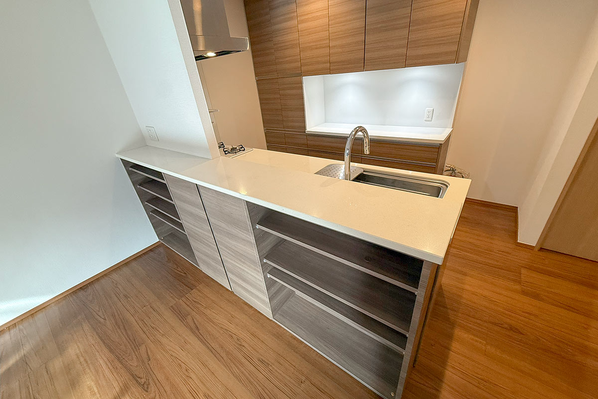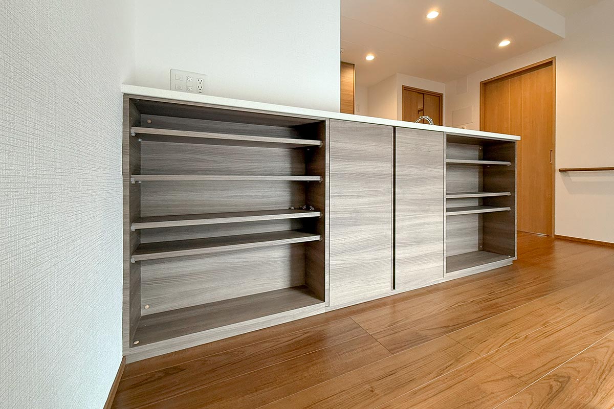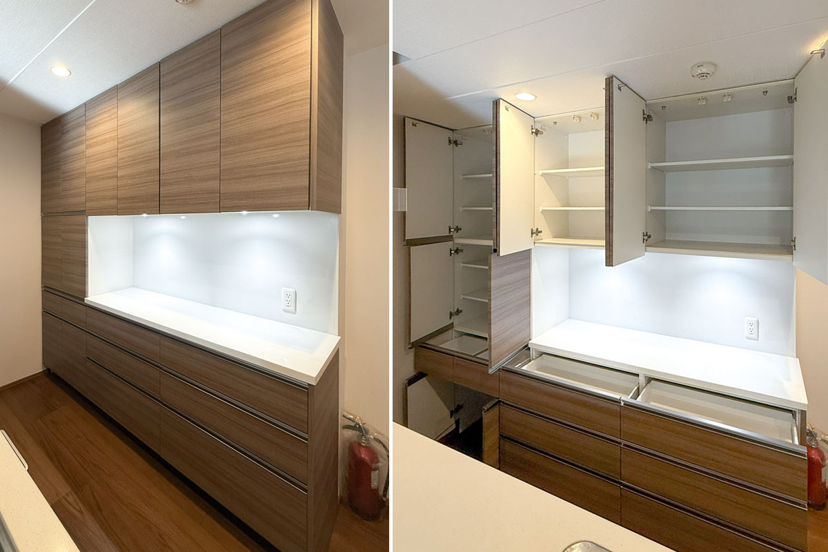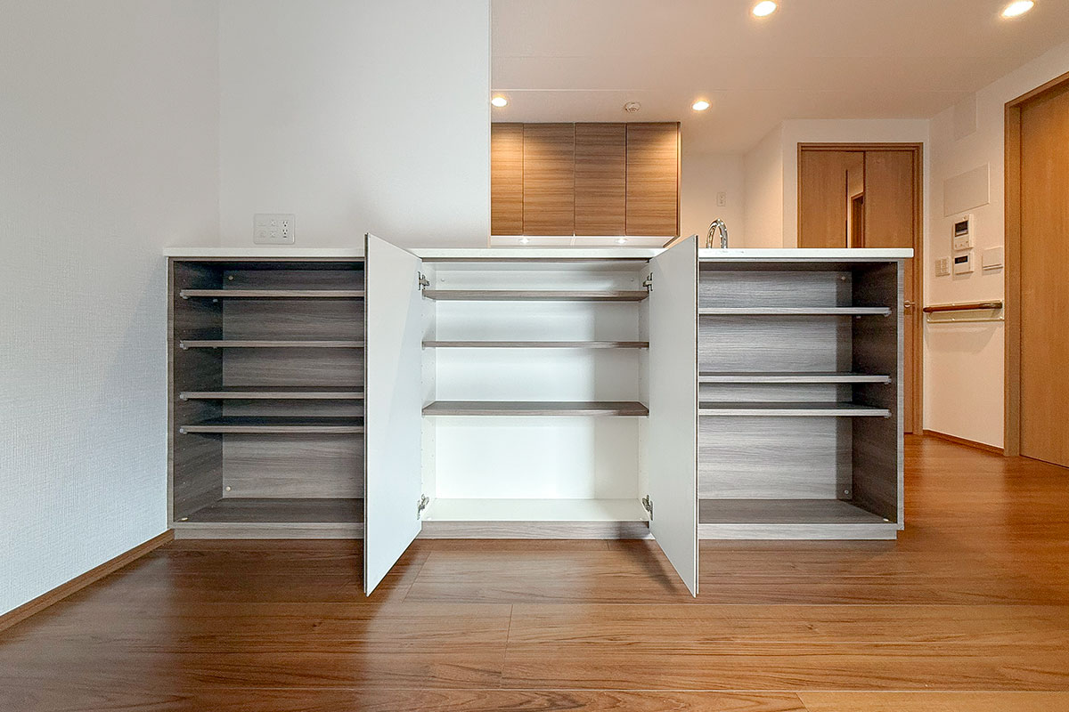使い勝手の良いカウンターキッチンには居室側と背面、それぞれに作り付けの食器棚があって圧巻の収納力!
