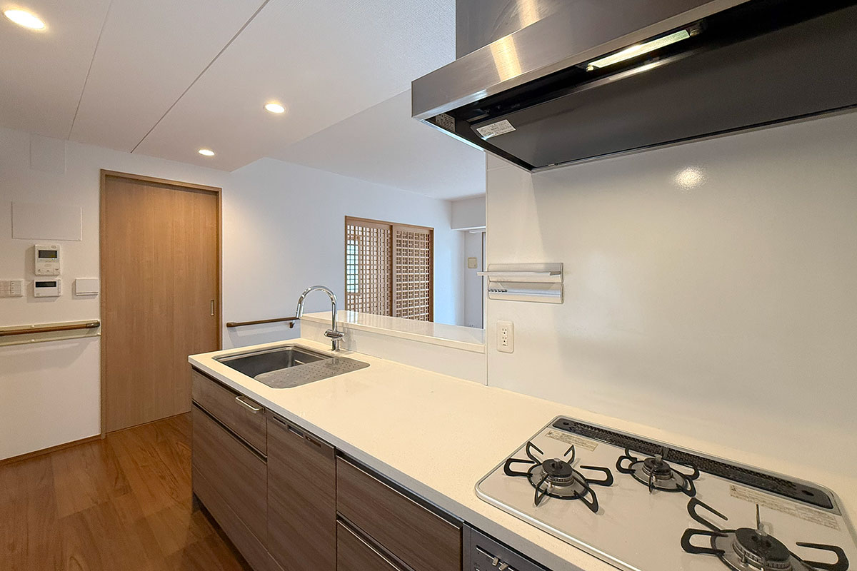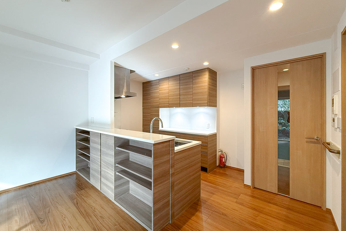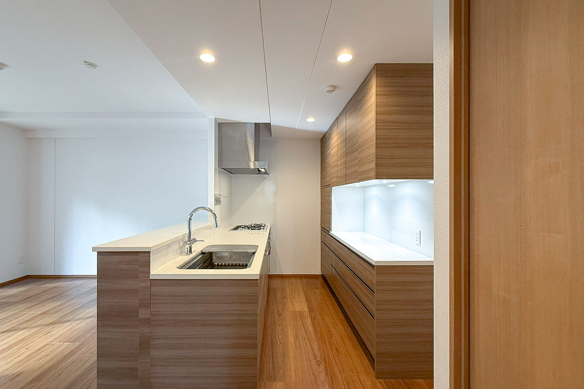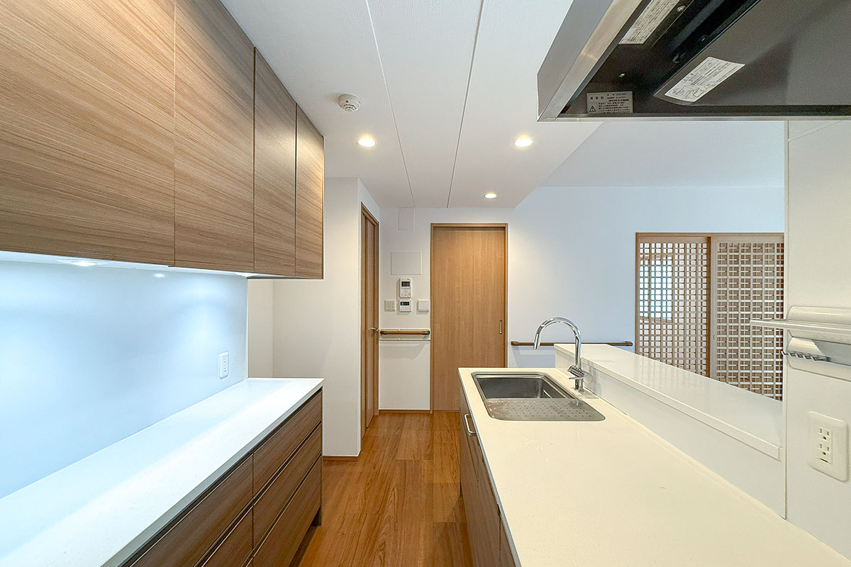 使い勝手の良いカウンターキッチンには居室側と背面、それぞれに作り付けの食器棚があって圧巻の収納力!