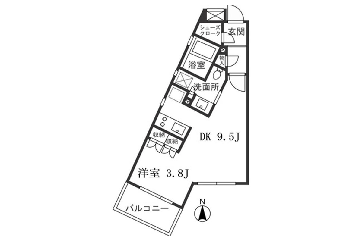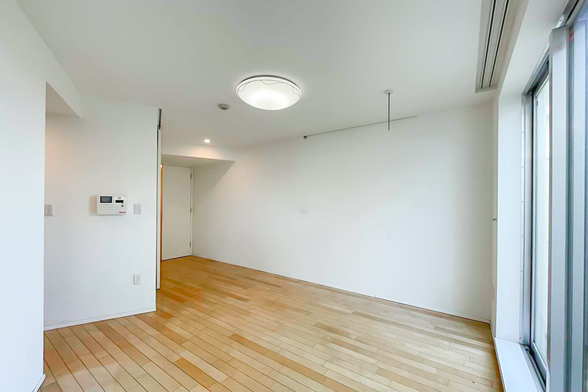 9.5帖のDKと3.8帖の洋室で、部屋の仕切りにはカーテンレールが付いています。