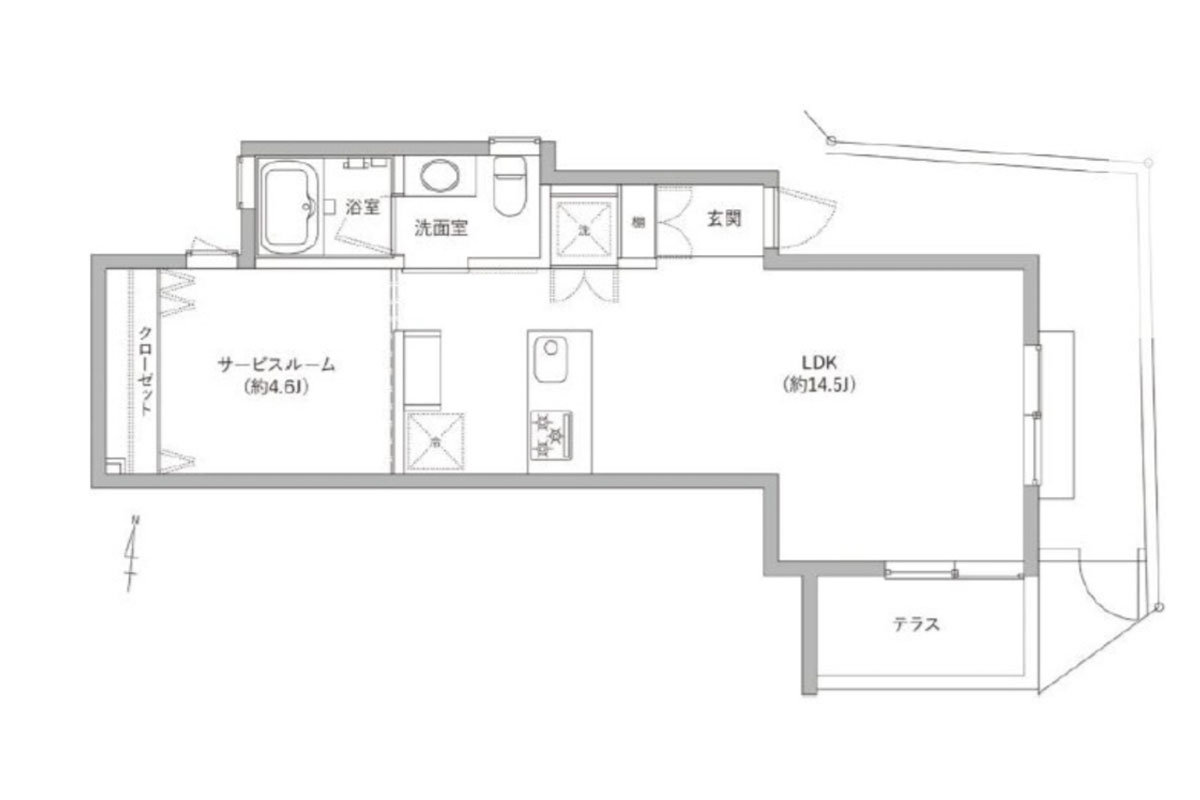 間取りは1LDKですが、洋室にあたる部分は間取り図上はサービスルーム表記となっています。