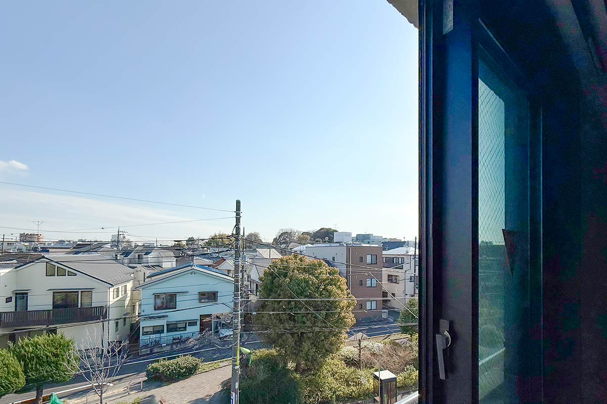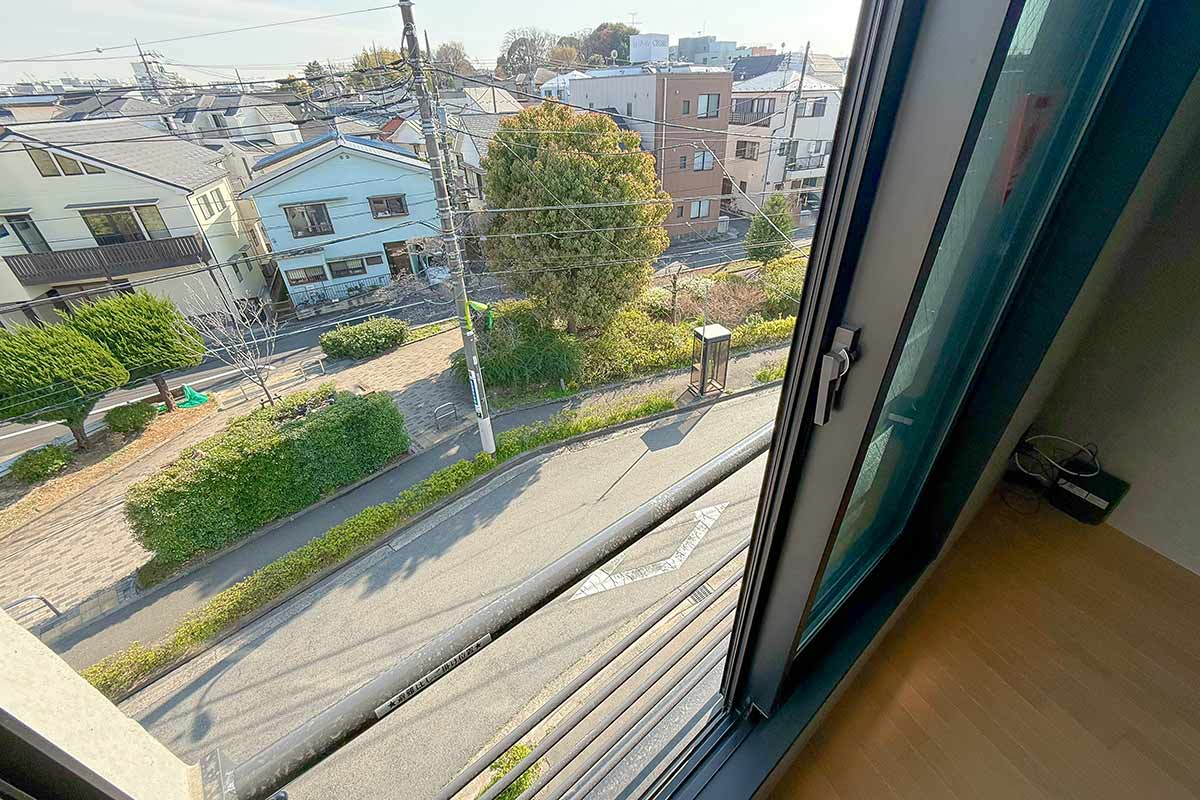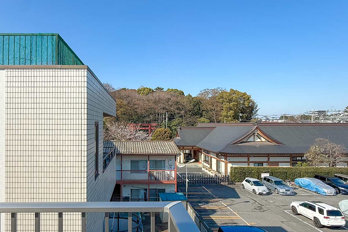 バルコニーの端まで行くと世田谷八幡宮の鳥居や森林も見えて、自然を楽しめる景観が広がります。
