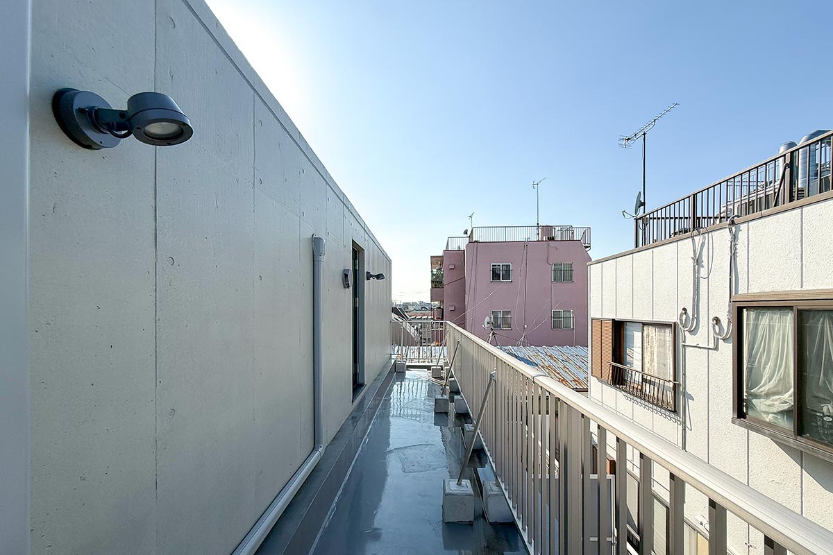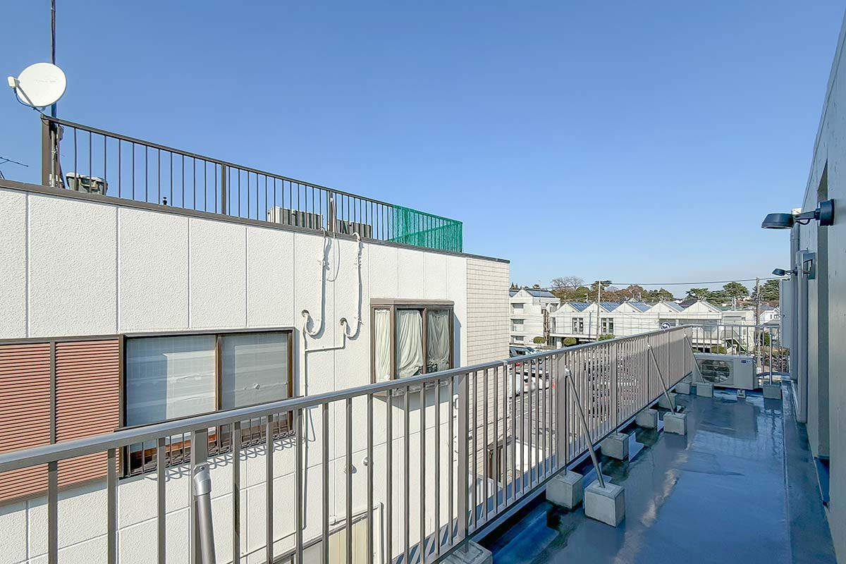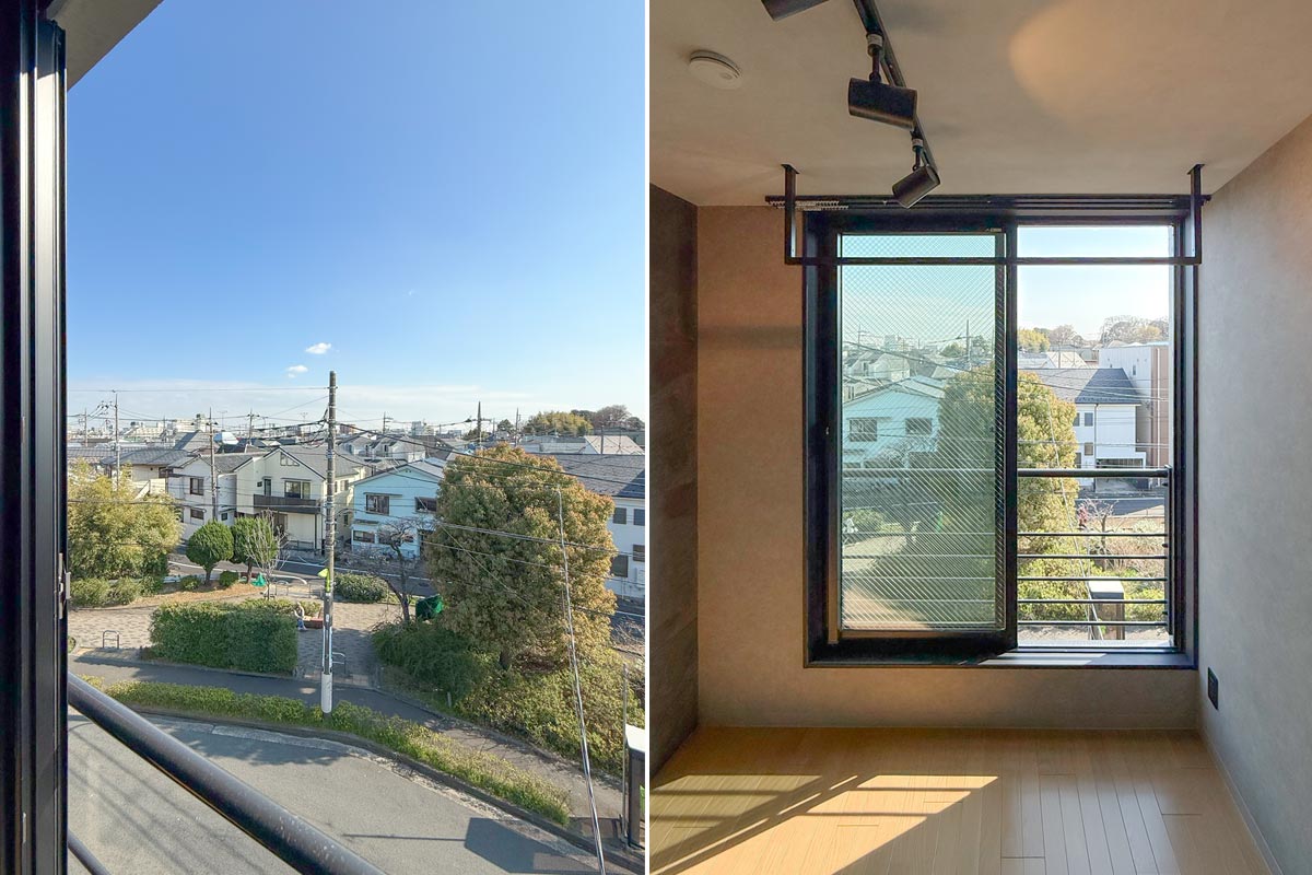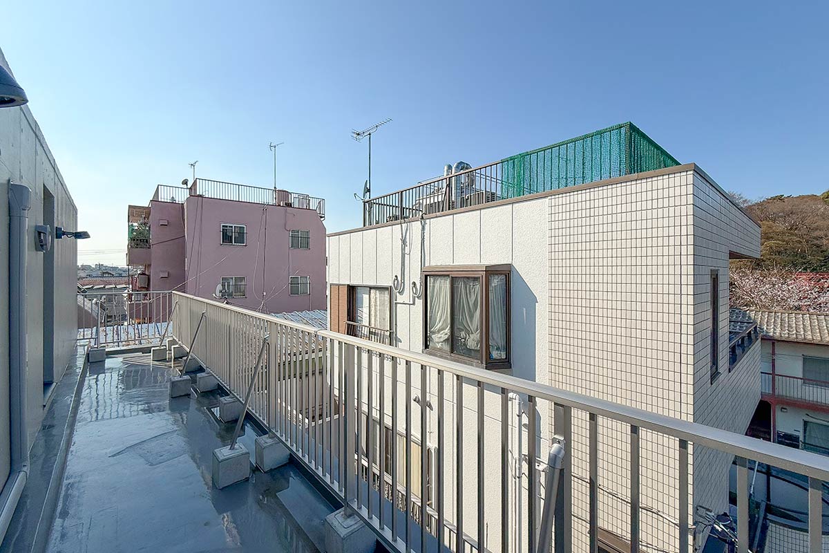 バルコニーの端まで行くと世田谷八幡宮の鳥居や森林も見えて、自然を楽しめる景観が広がります。
