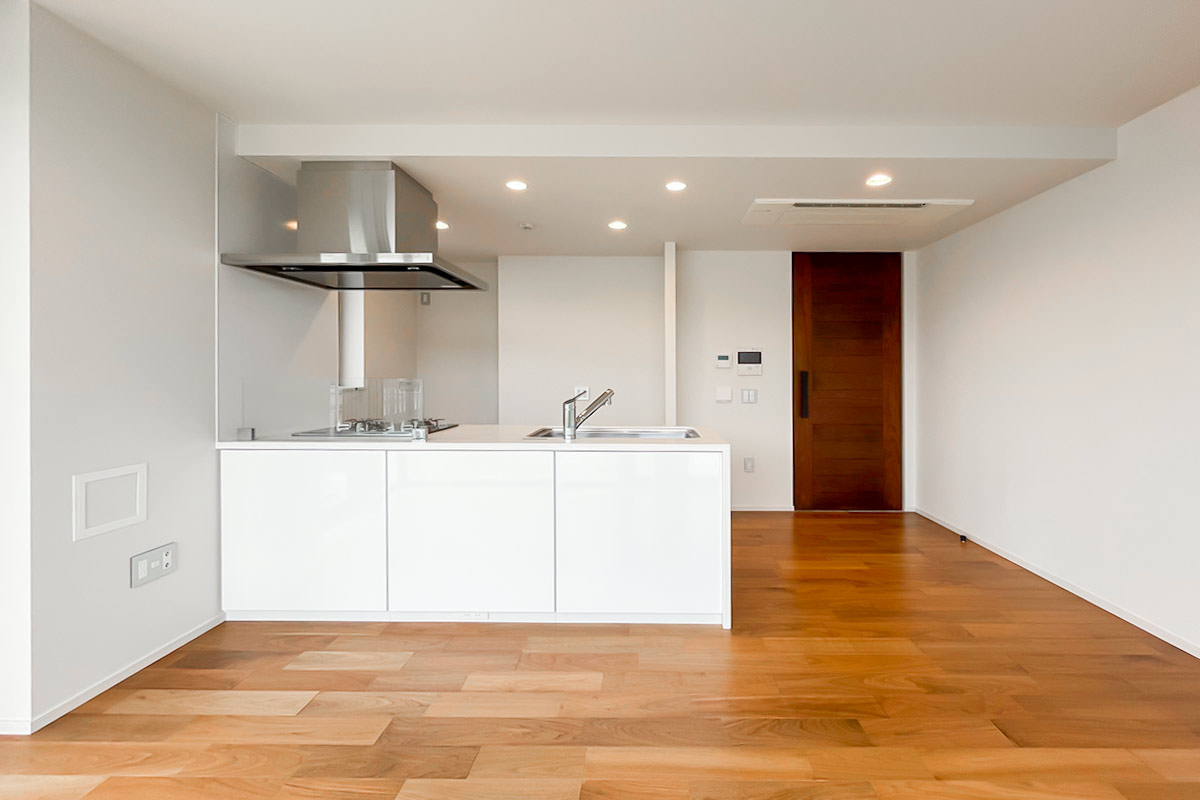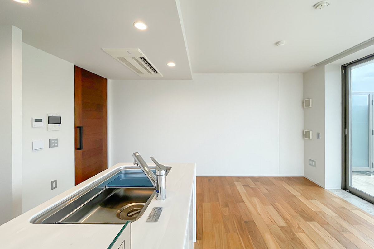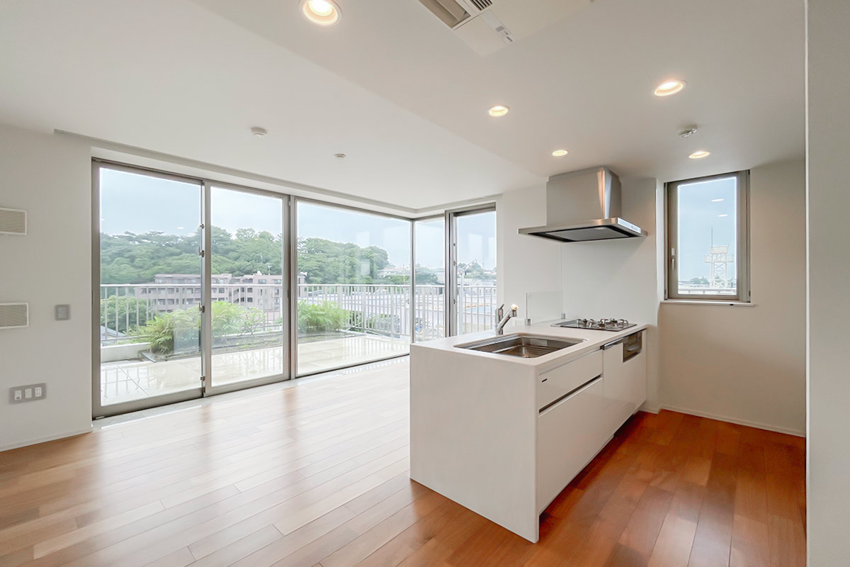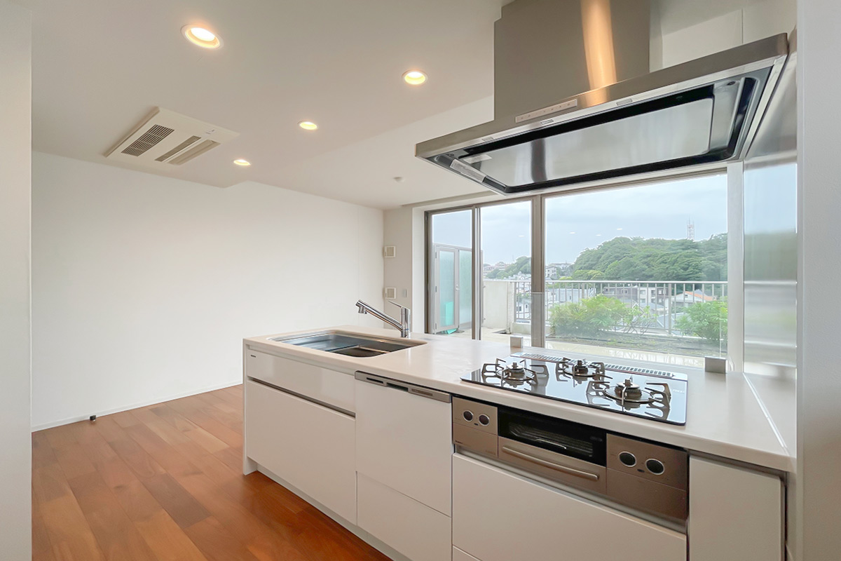 清潔感のある白のカウンターキッチンはお部屋や外の景色がよく見える配置。