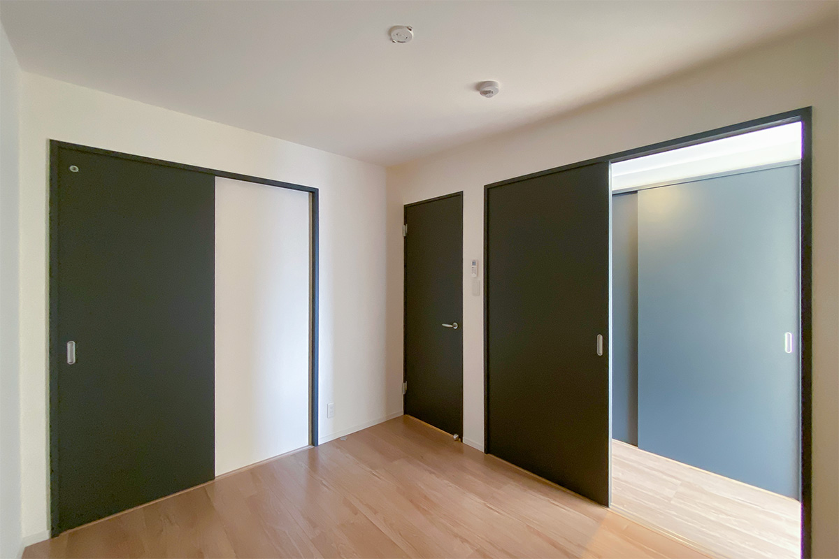 室内はブラウンのフローリングにダークトーンの建具をあしらった、シンプルでシックな内装。