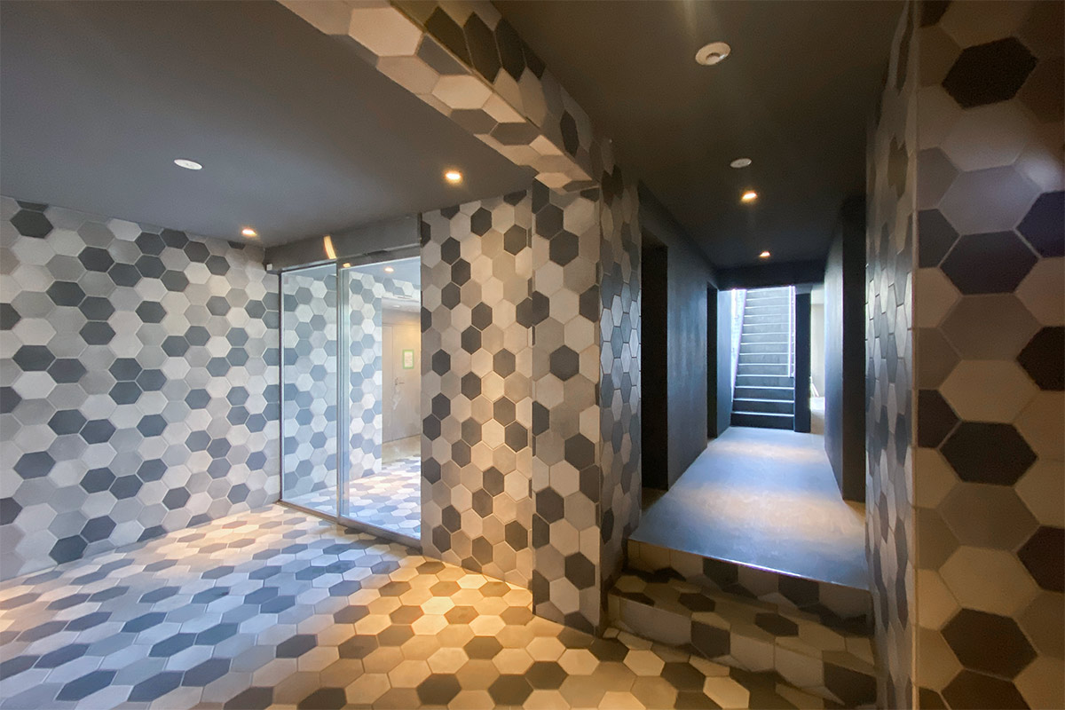 アーティスティックなハニカム模様のエントランスがお出迎えしてくれ、なんだか気分が上がります。