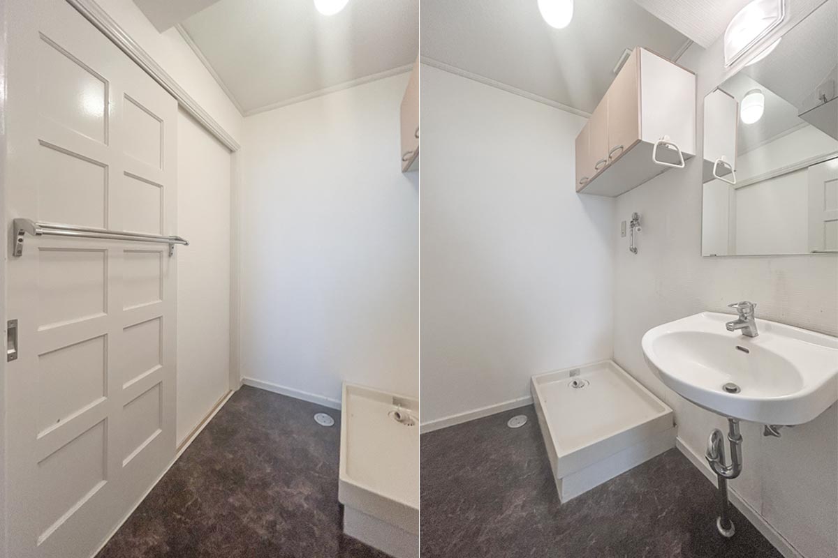 浴室、洗面所共にレトロですが、浴室は広めで、真っ白いタイルに手すり付き。