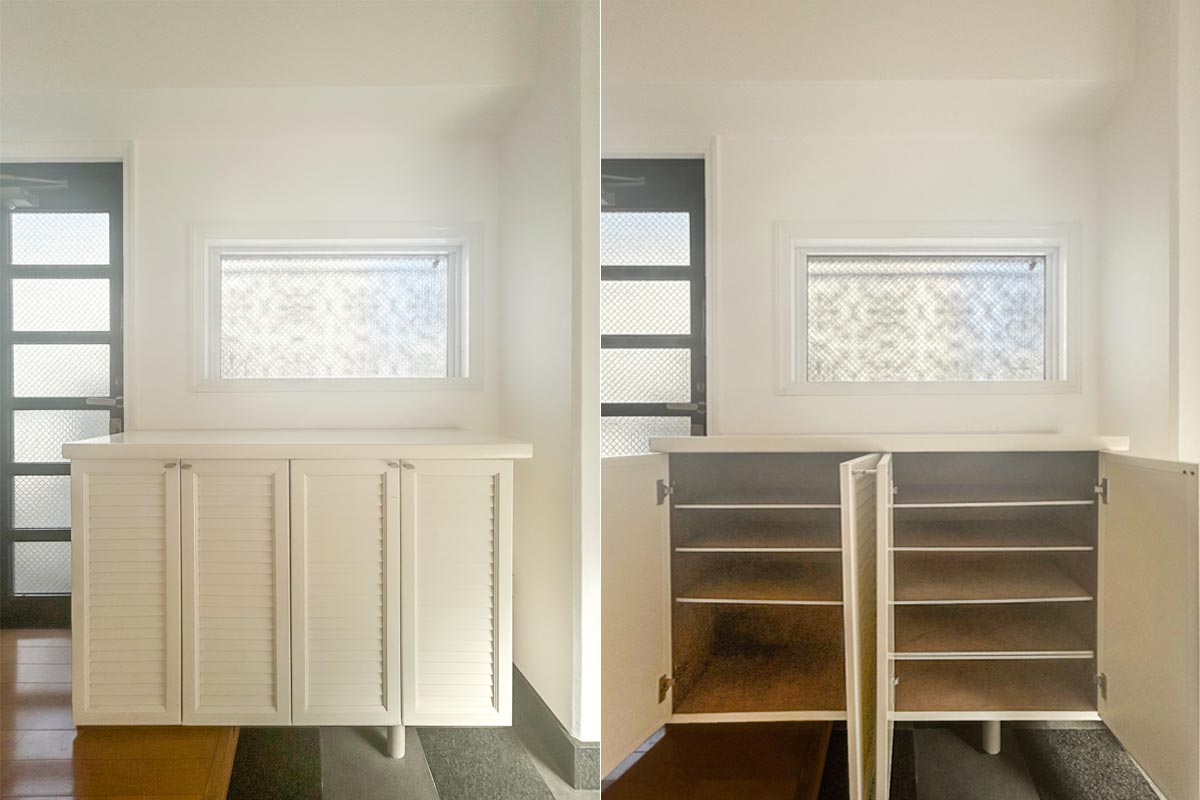 玄関正面の収納も上下に分かれており、収納量も使い勝手も十分。