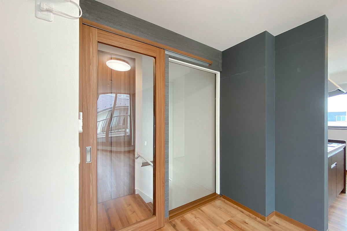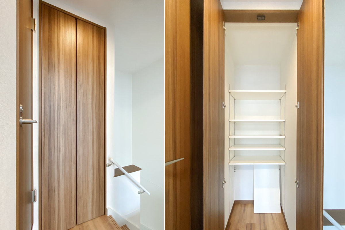 1階部分には収納が無いので、階段をのぼりきった所にある収納スペースをシューズボックスとして活用を。