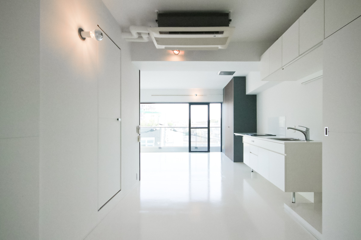 室内に入ると壁も床も真っ白な空間の中に、ブラウンの大きなスライドドアと、同じくブラウンの収納スペースの扉が目にとまります。