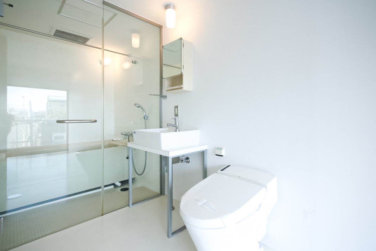 スライドドアを開けると、なんとトイレと洗面台、そしてガラス扉のバスルーム。