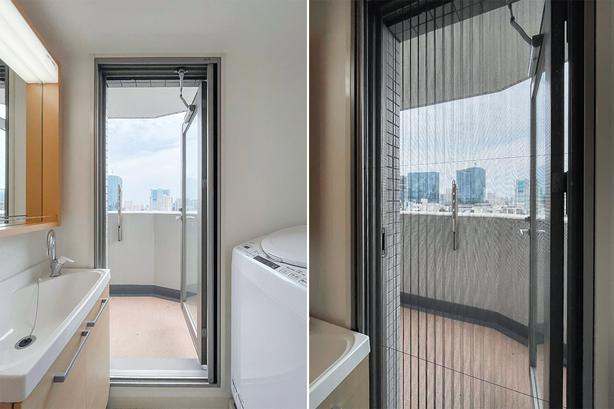 ちなみに脱衣所からもバルコニーに出ることができ、こちらには洗濯物を干すホスクリーン付き。こちらも眺望良いです。湯あがりにここで涼んでも良さそう。