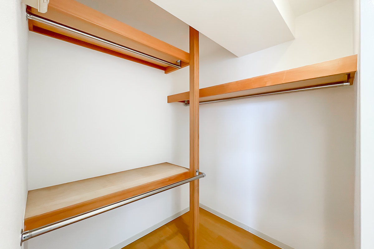 収納は玄関からすぐにウォークインクローゼットに入れる形。扉には鏡も付いているので姿見要らず。L字に棚が配置され、ハンガーパイプは3本!洋服好きも安心のボリューム感です。