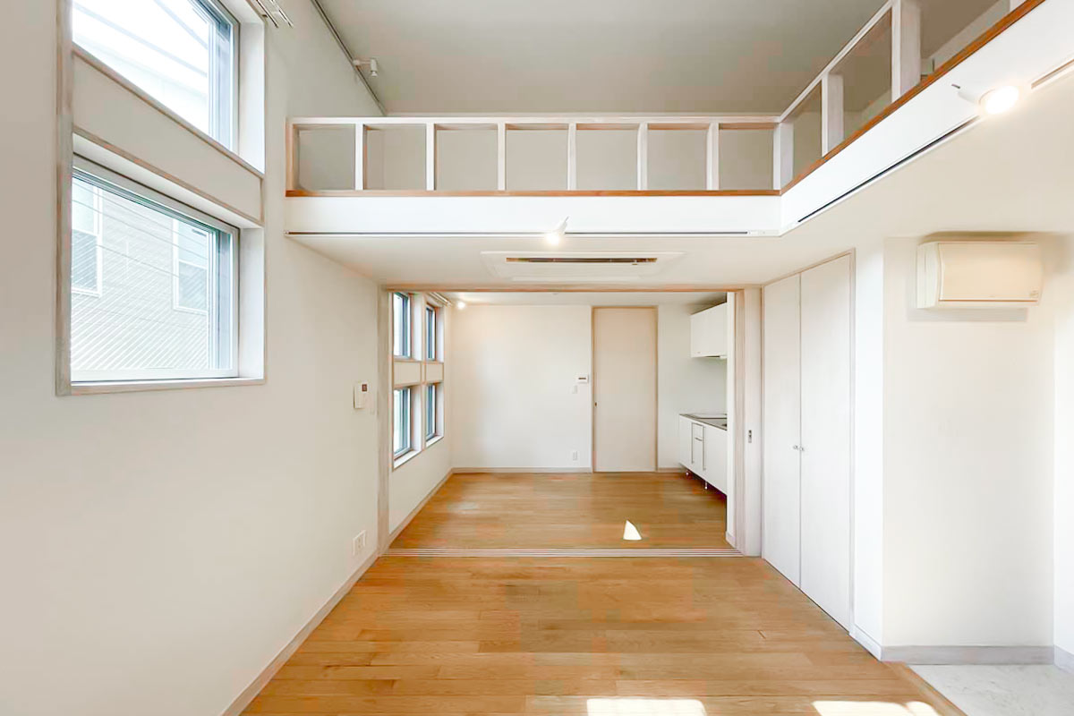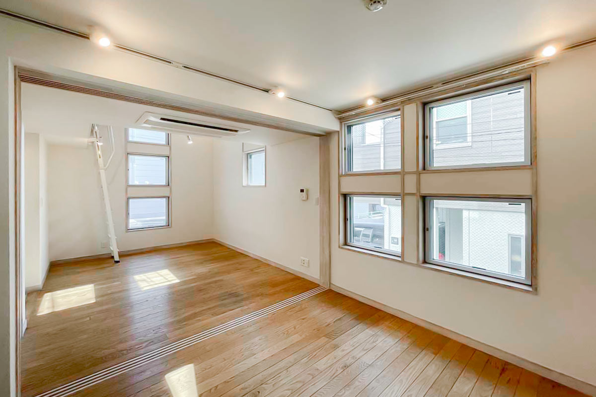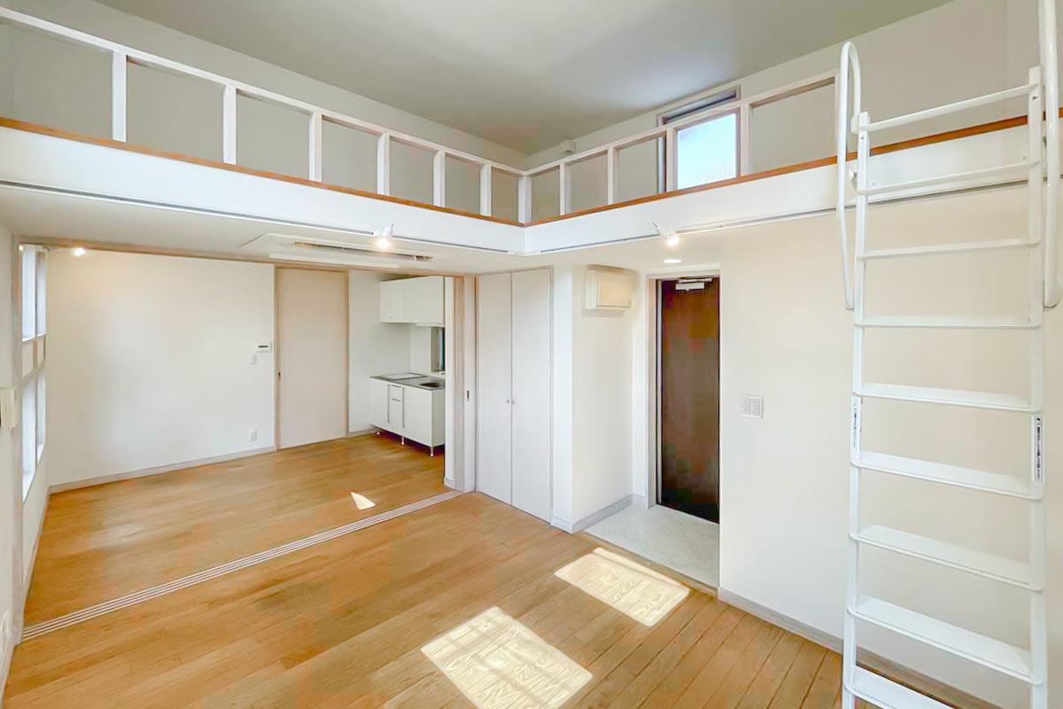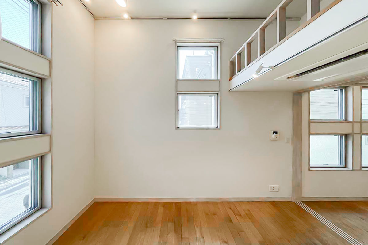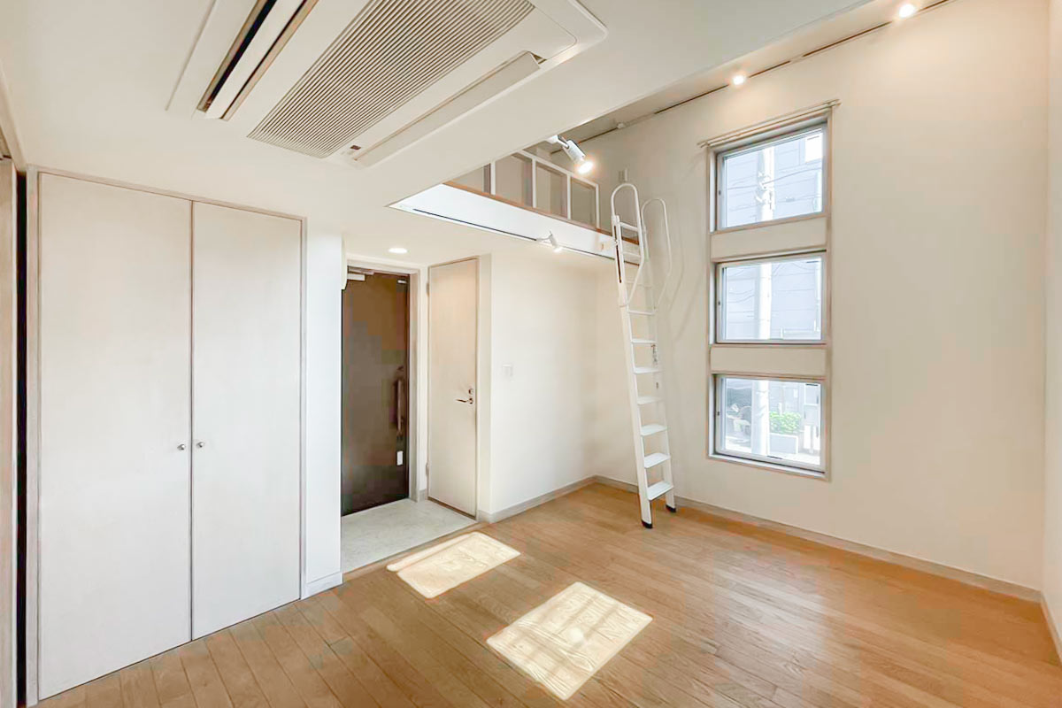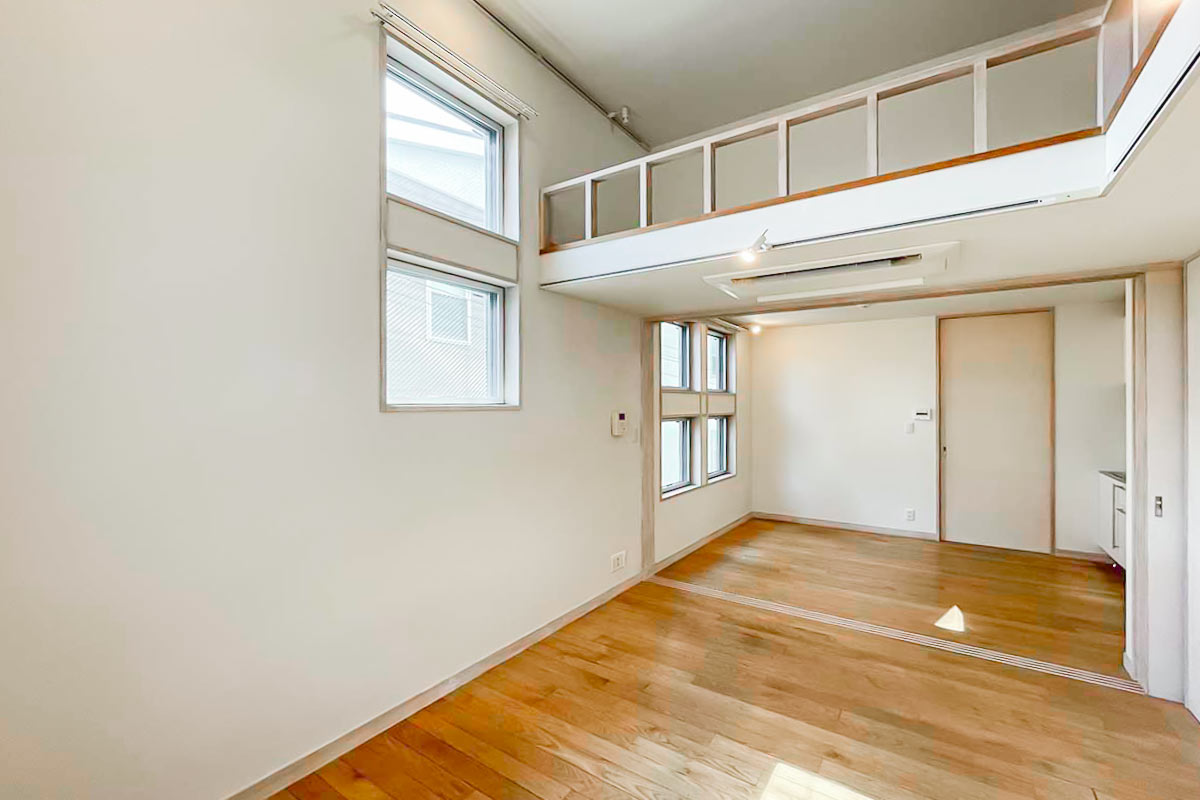 1DKの表記ですが、扉を開放すれば10帖のワンルームになります。またロフトがあることで天井高く、写真の部屋と同じように部屋の長辺に窓がたくさんついており、明るく開放的な空間です。
