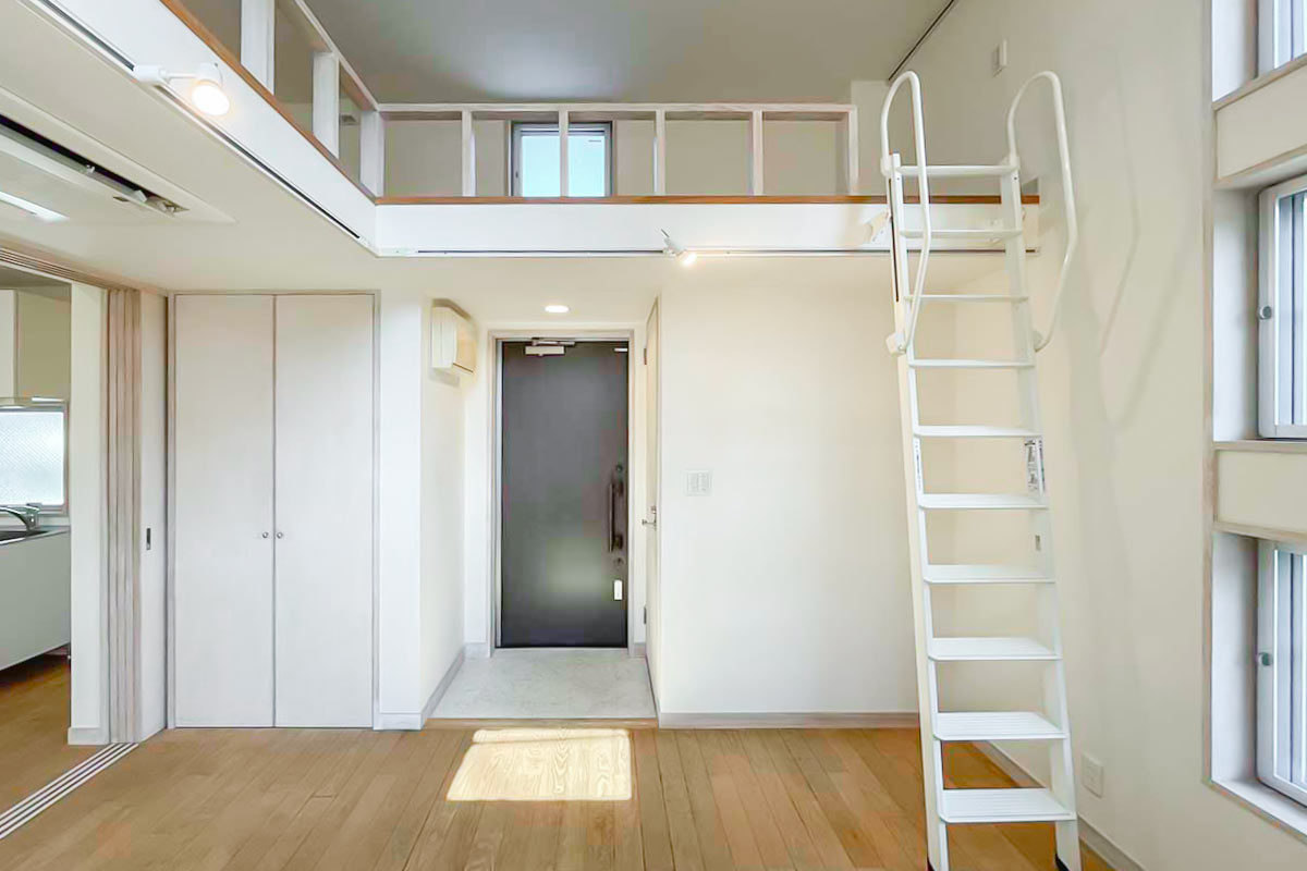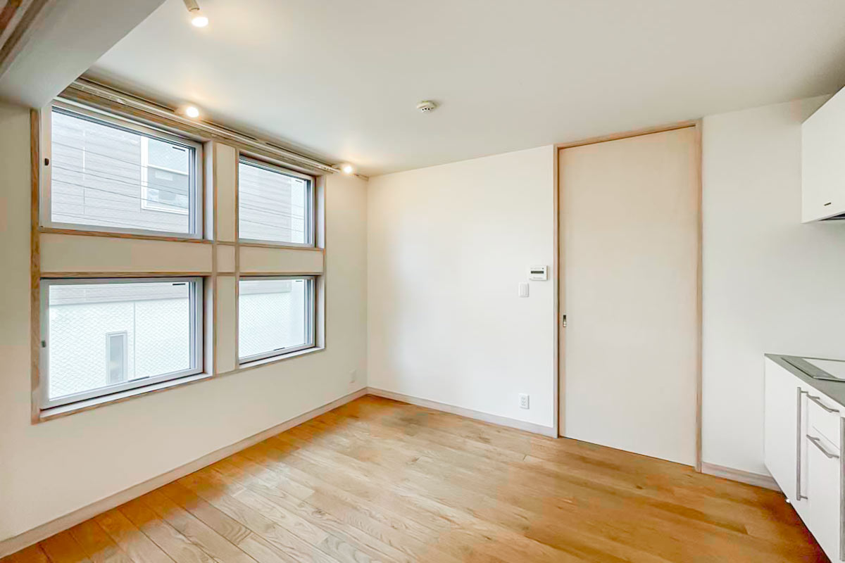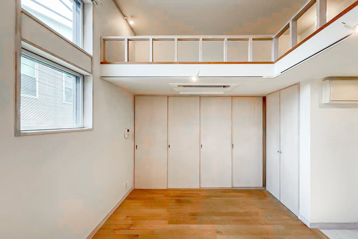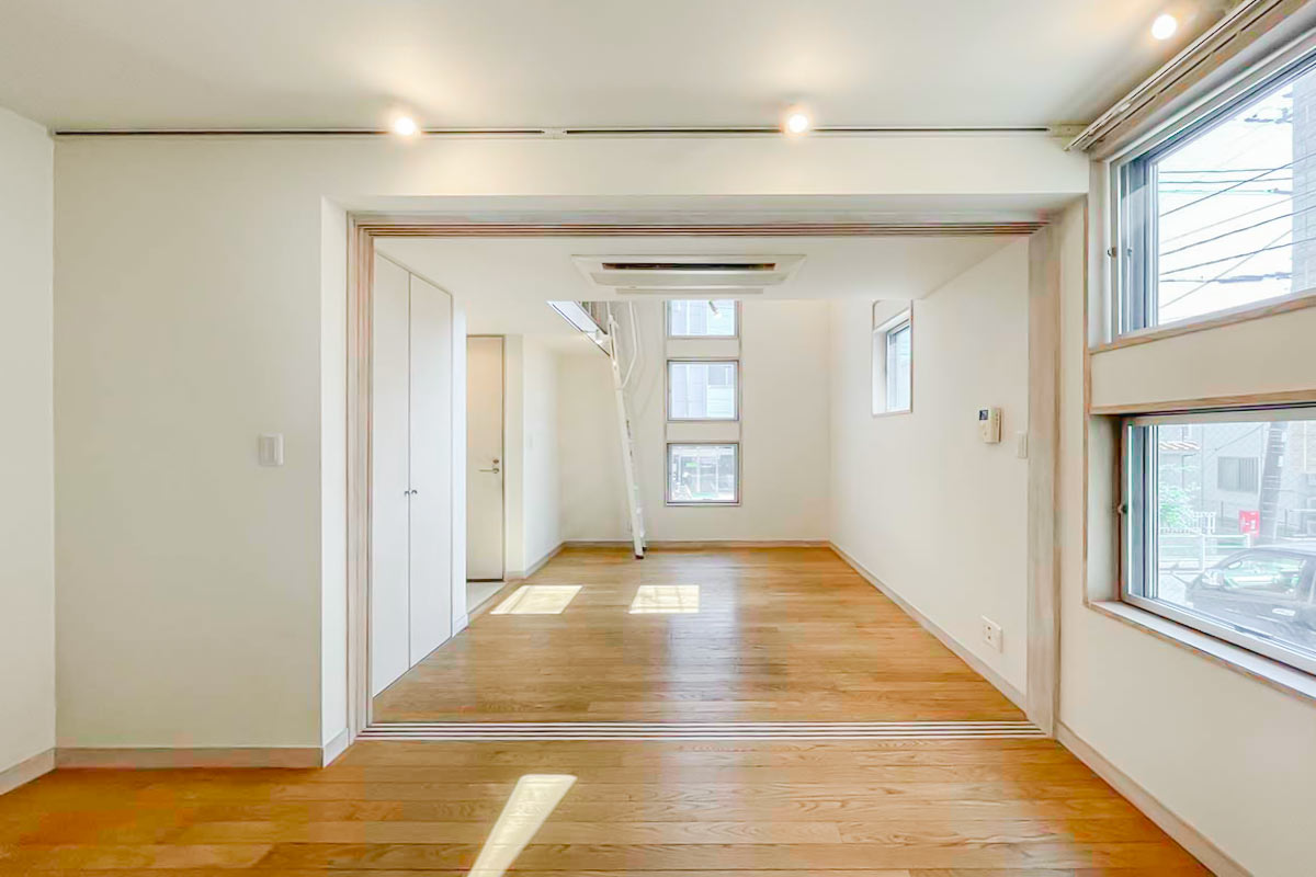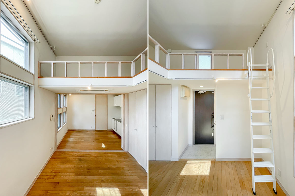 1DKの表記ですが、扉を開放すれば10帖のワンルームになります。またロフトがあることで天井高く、写真の部屋と同じように部屋の長辺に窓がたくさんついており、明るく開放的な空間です。