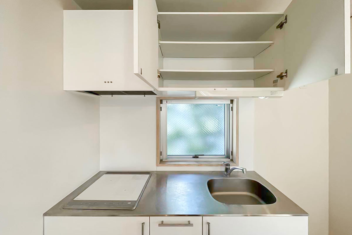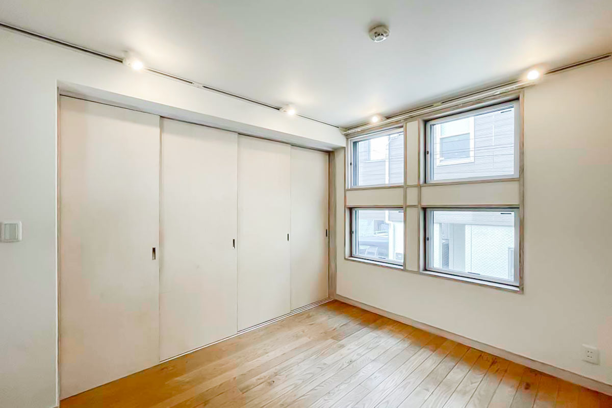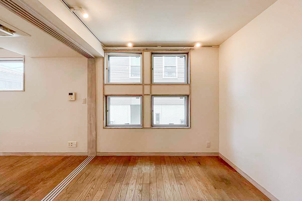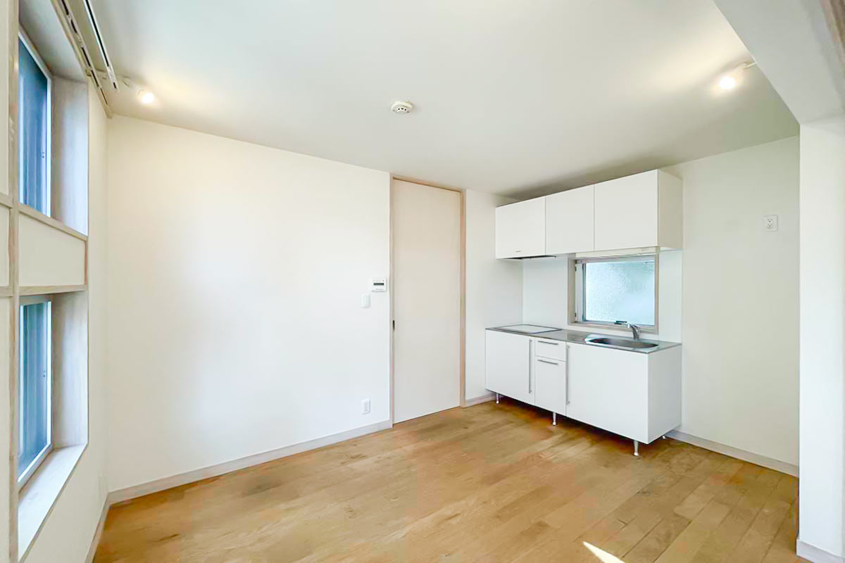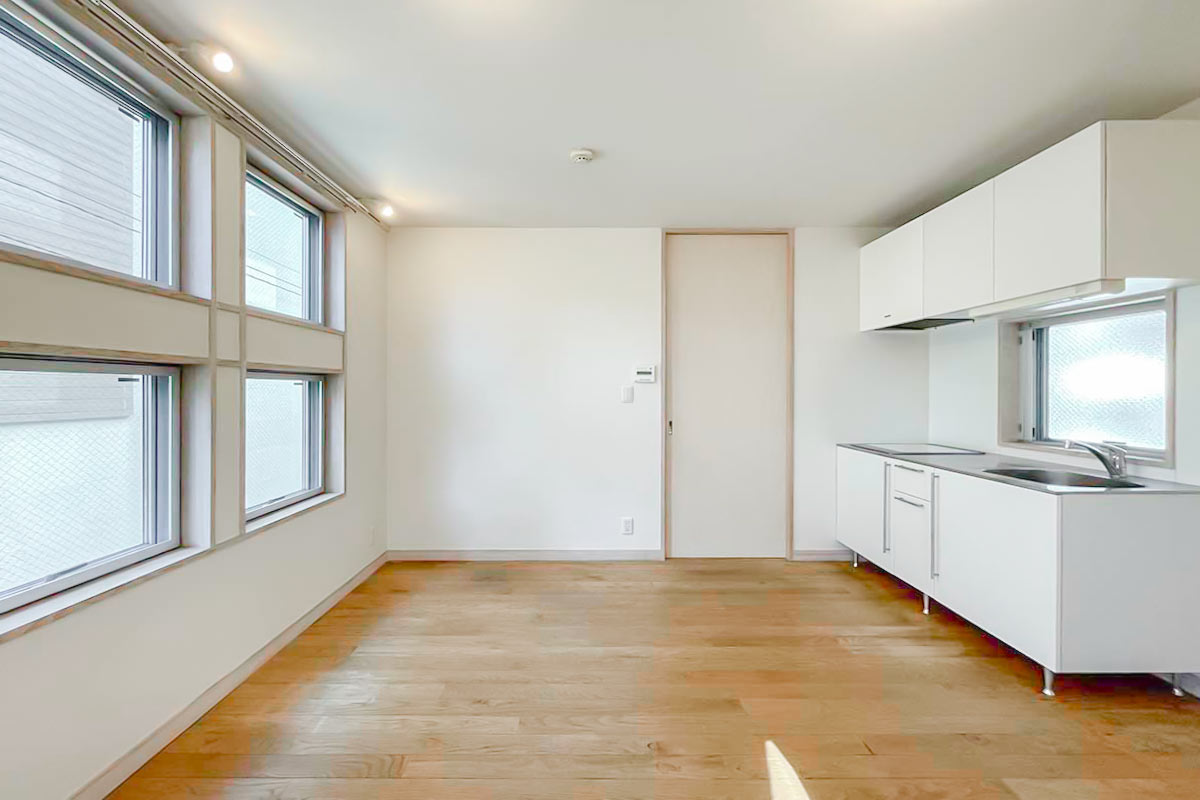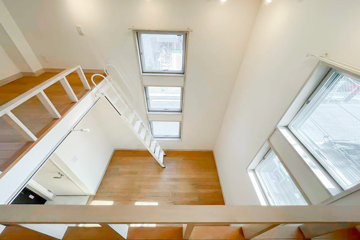 1DKの表記ですが、扉を開放すれば10帖のワンルームになります。またロフトがあることで天井高く、写真の部屋と同じように部屋の長辺に窓がたくさんついており、明るく開放的な空間です。