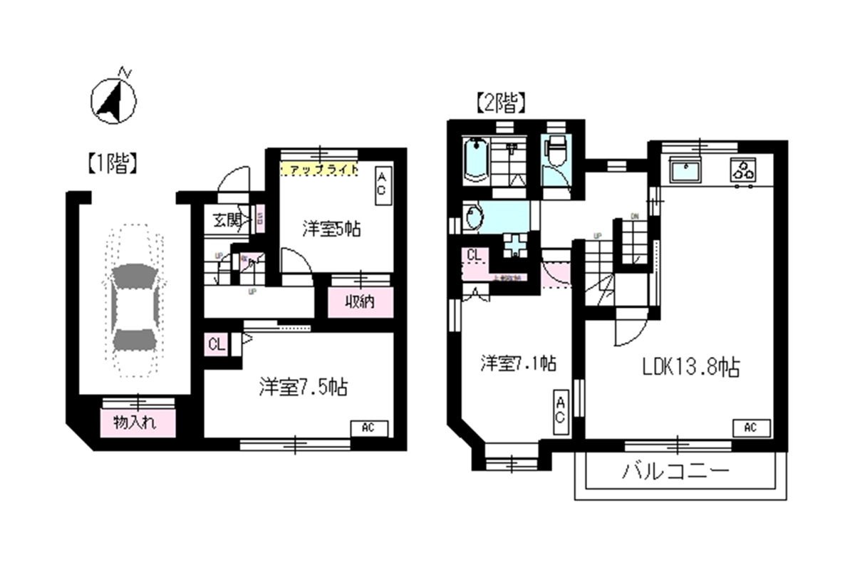 1階に7.5帖と5帖の洋室、2階に13.8帖のリビングと7.1帖の洋室。