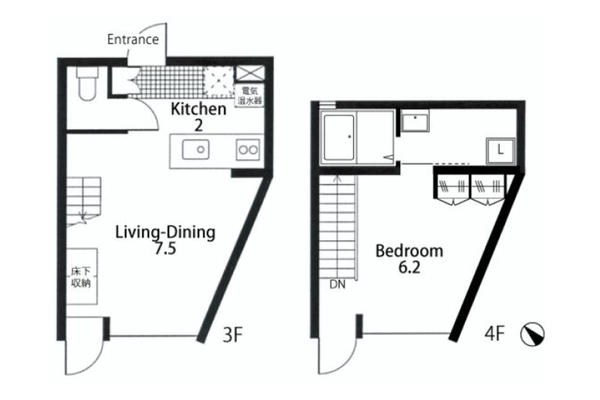 お部屋は3~4階メゾネット物件、約40㎡の1LDKメゾネット。
