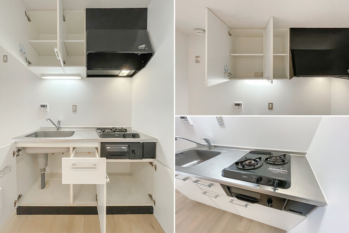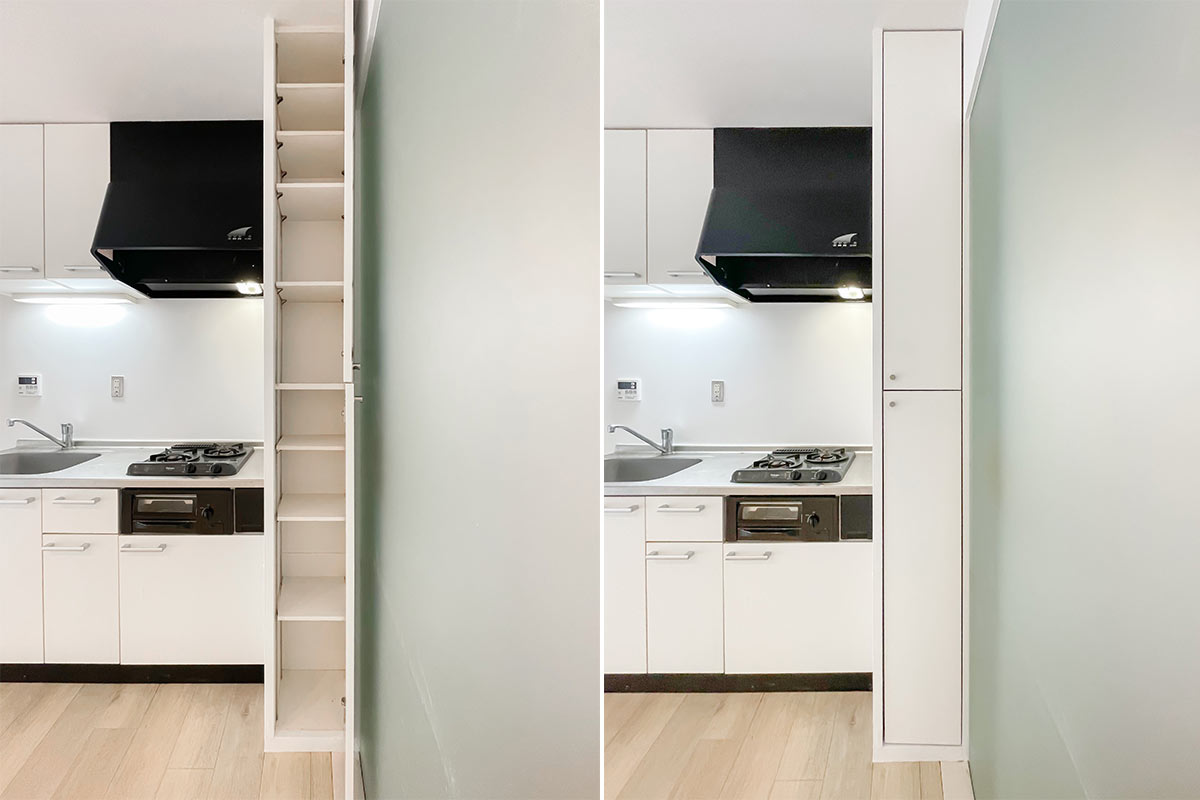 玄関の靴箱はもちろん、キッチン横、DK、洋室それぞれの空間にたっぷりと扉付きの収納が備わっています。