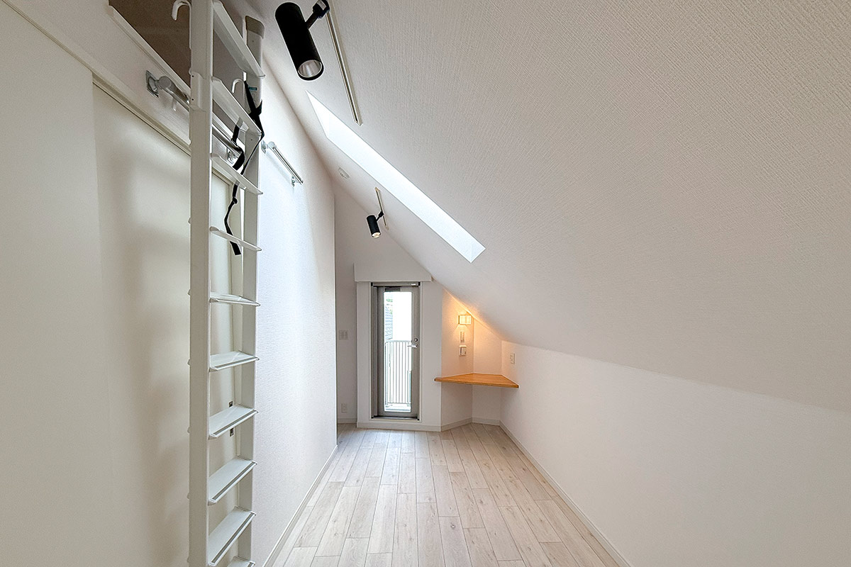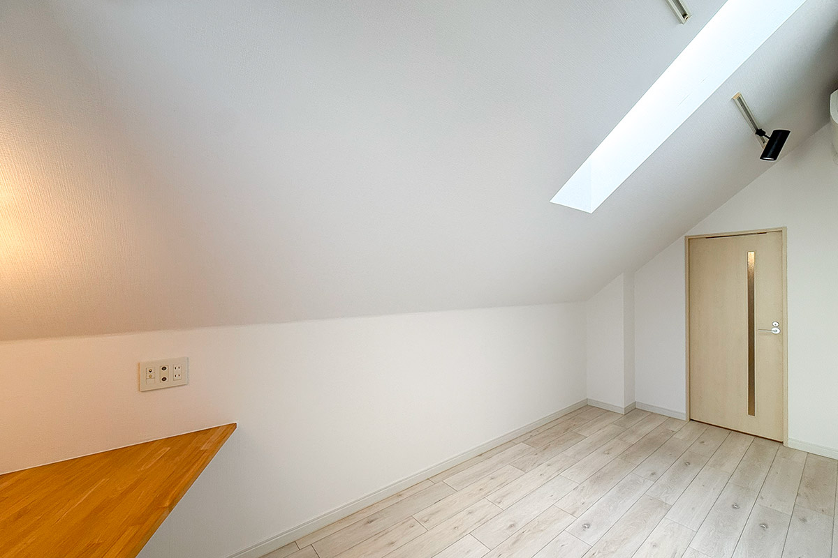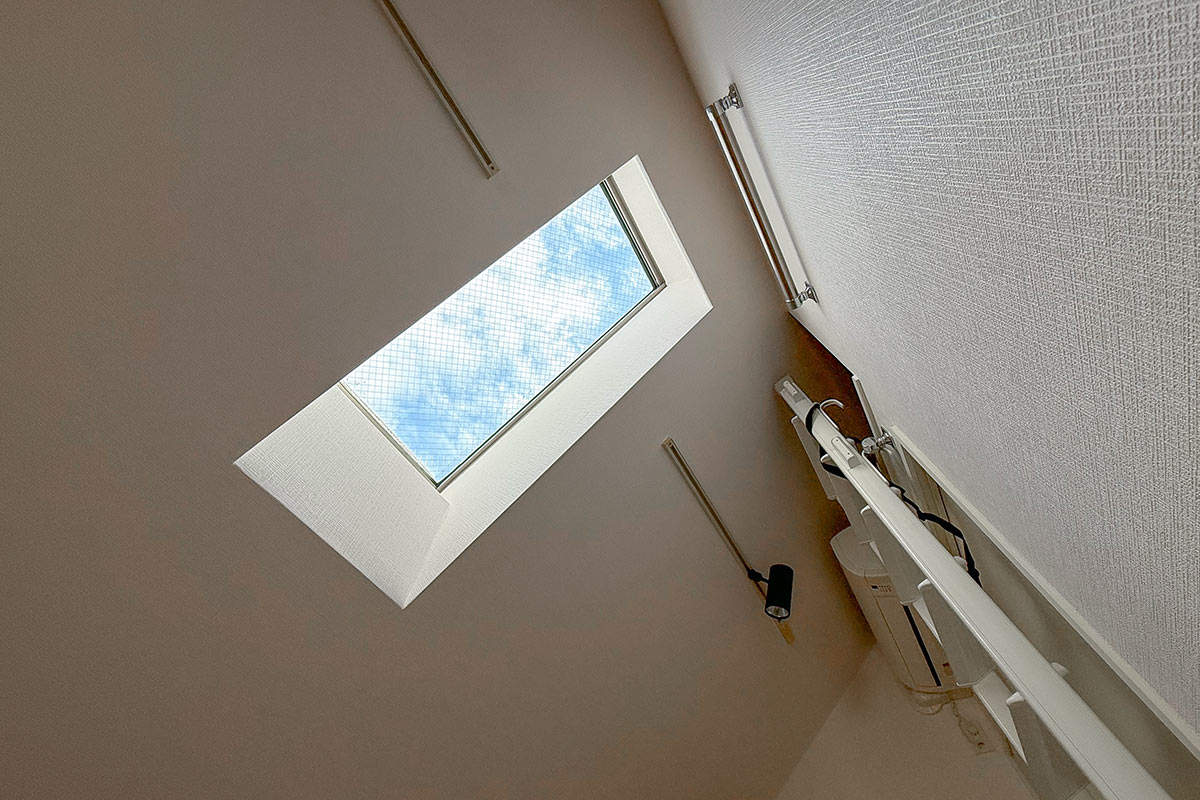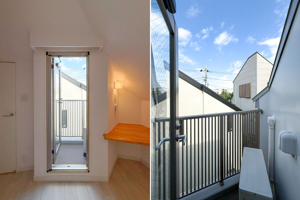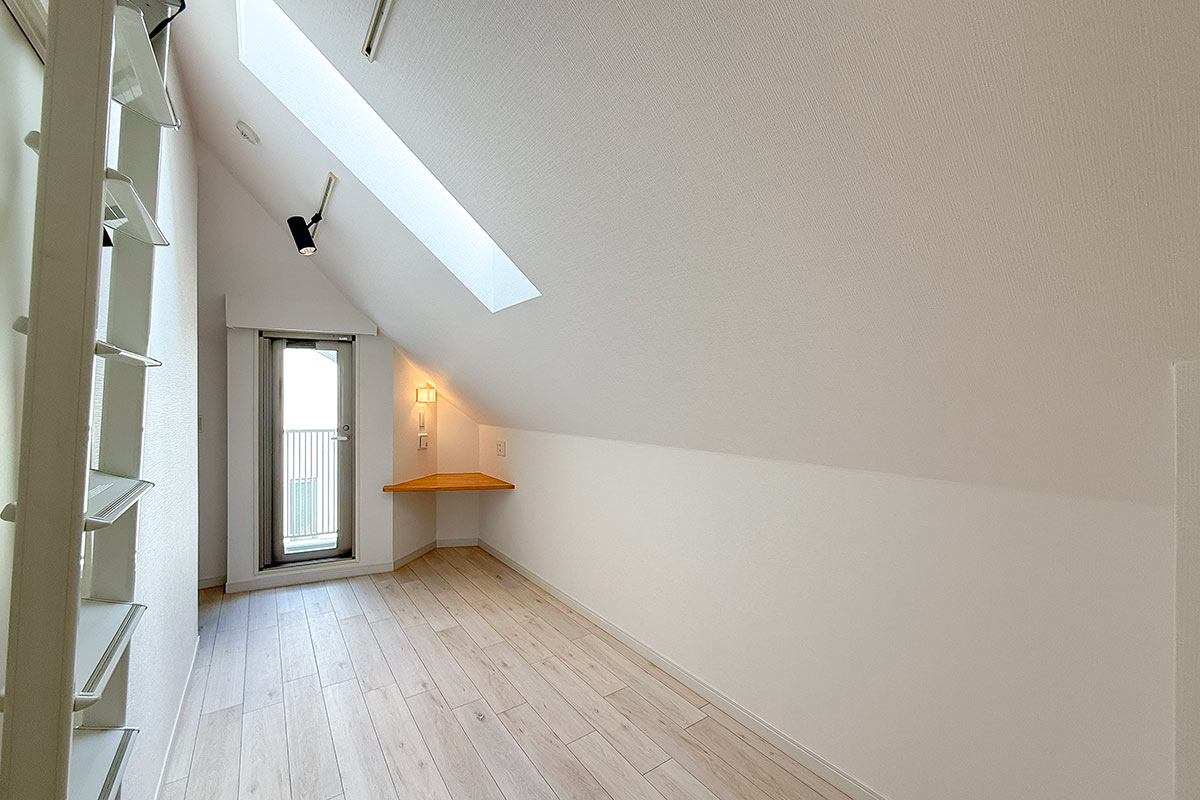 バルコニーは北側ですが、天窓が付いていて空からの光も入り、室内の色調も相まって明るい雰囲気があります◎
