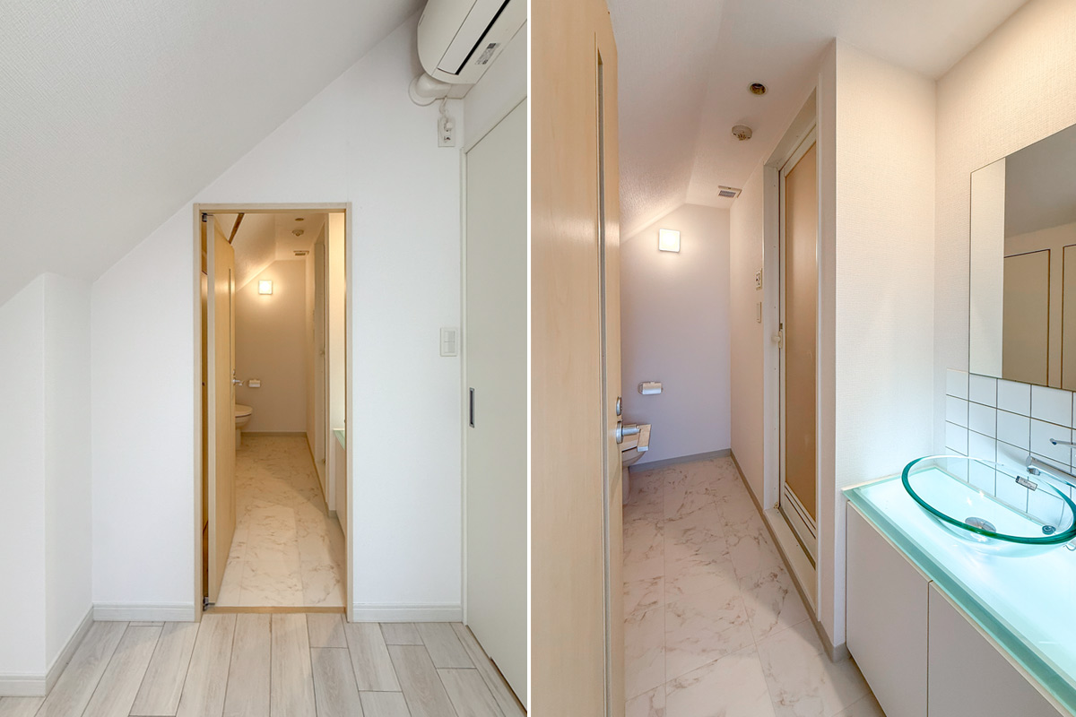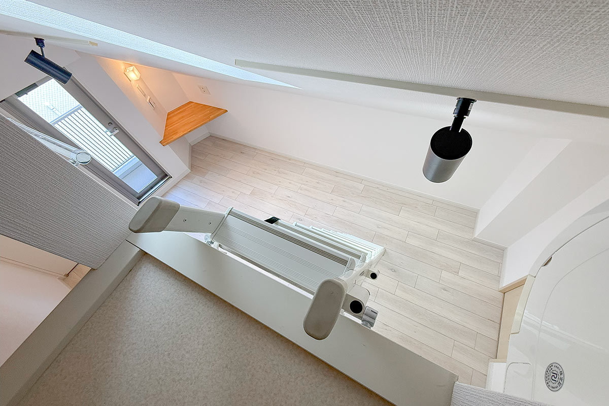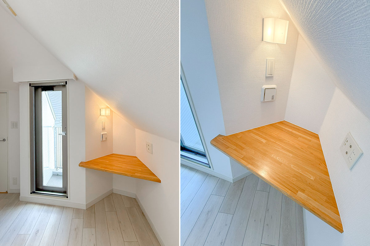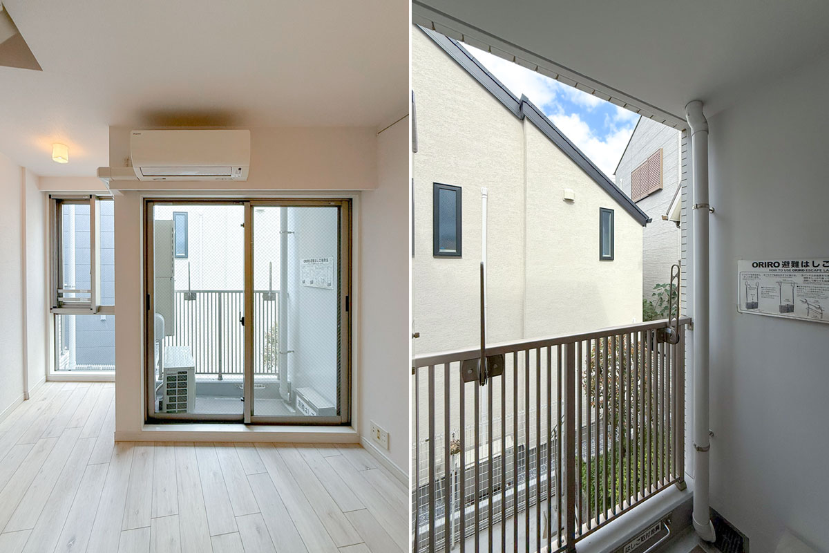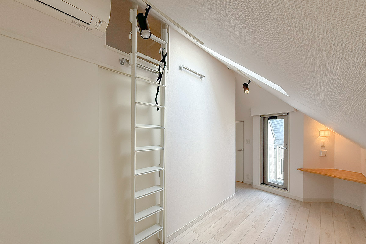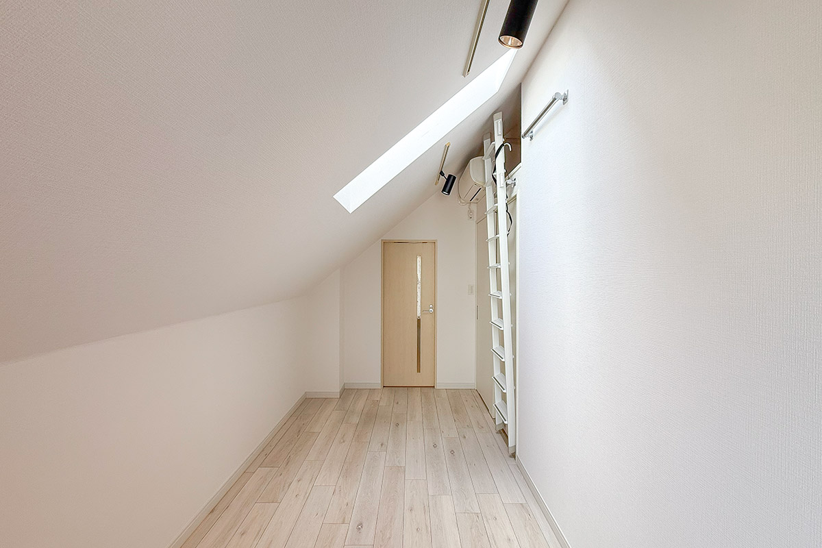 バルコニーは北側ですが、天窓が付いていて空からの光も入り、室内の色調も相まって明るい雰囲気があります◎