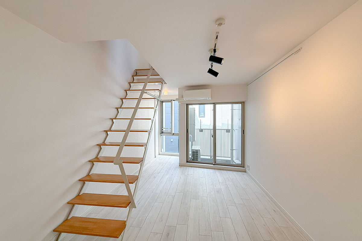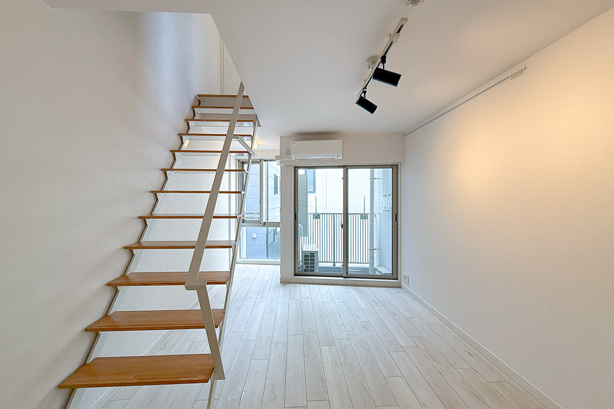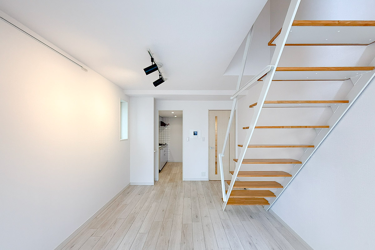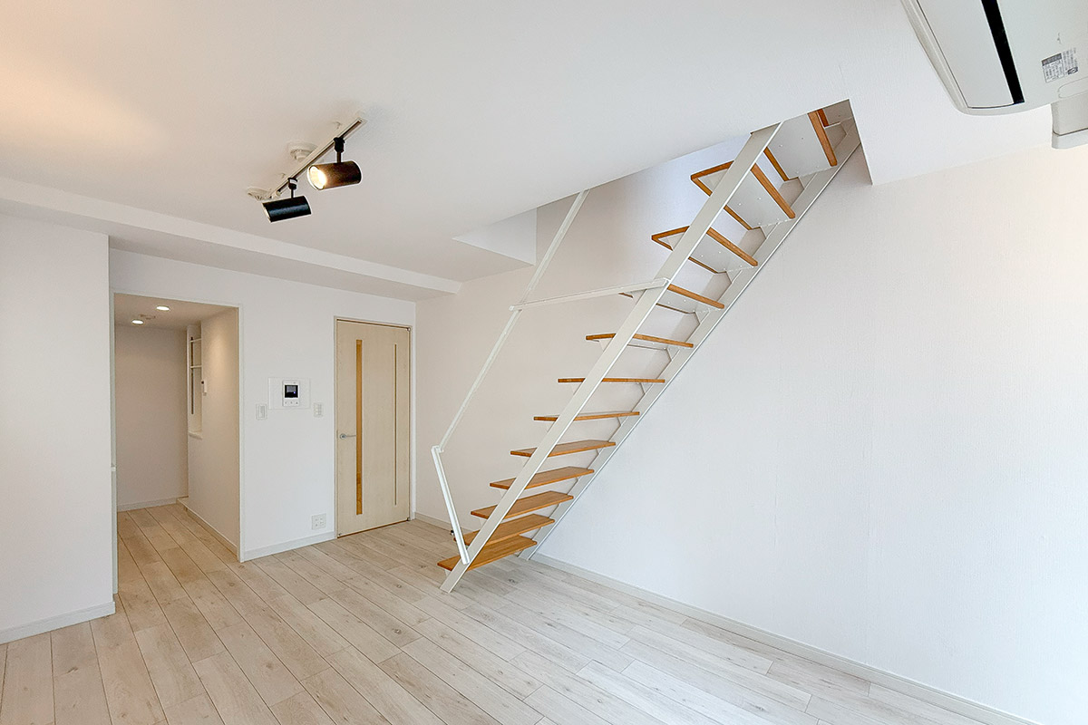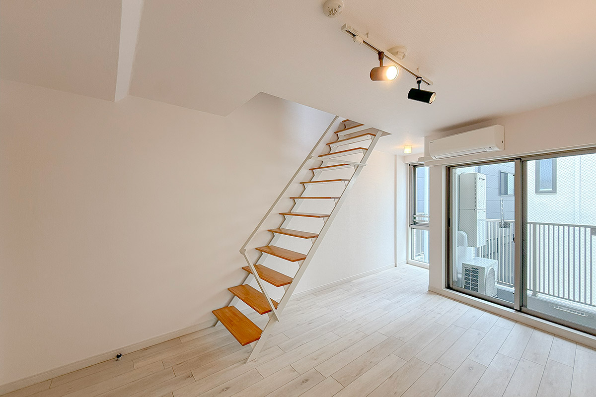 募集中のお部屋は2階の角部屋、約10帖のリビングと約6.9帖の洋室からなるメゾネットタイプ。