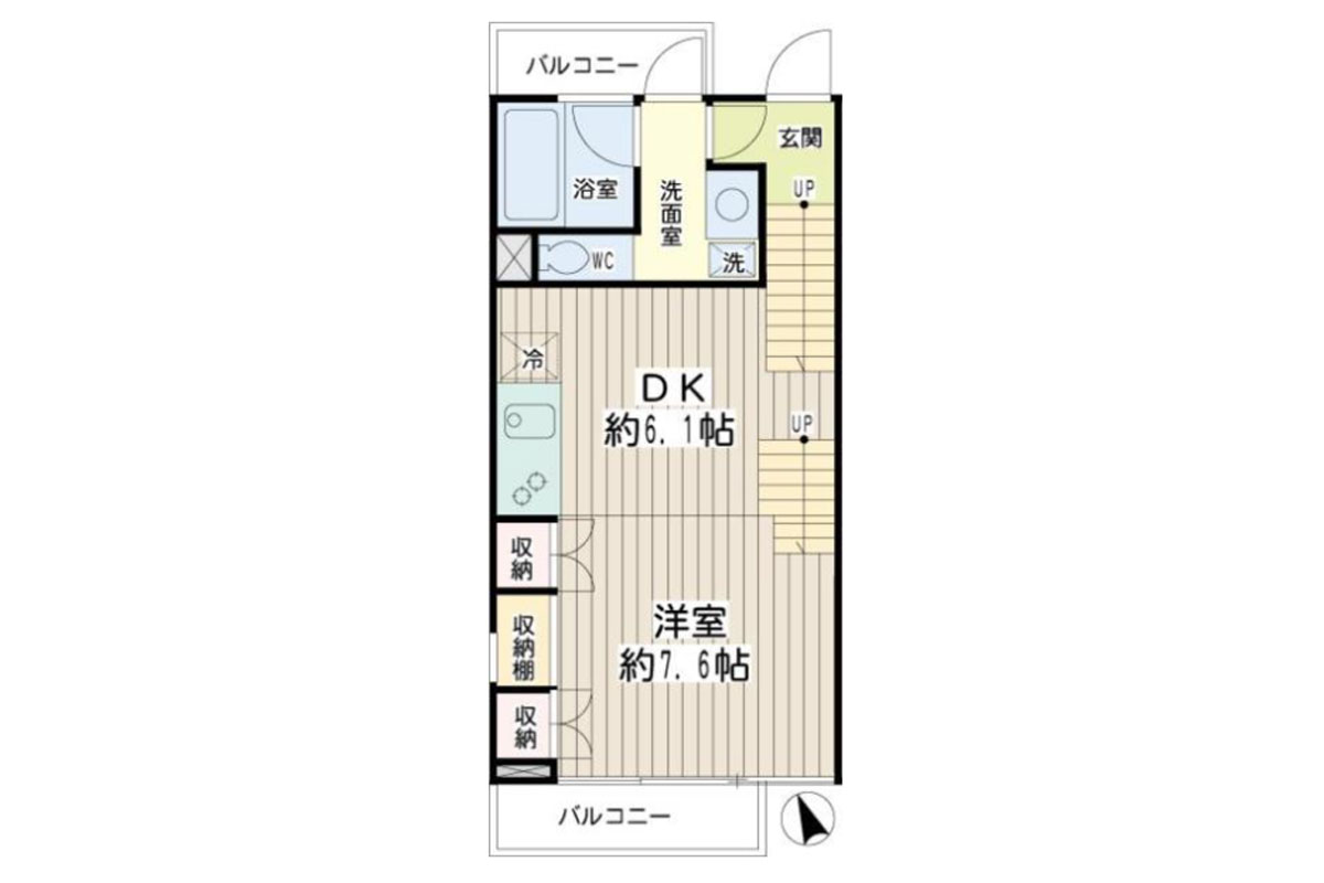 こちらの洋室と下のダイニングフロアの間は壁がなく柵で隔たれているので、南向きのバルコニーからダイニングへも光が差し込み明るさが確保されています。