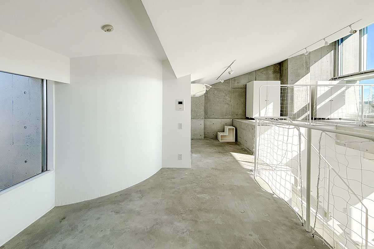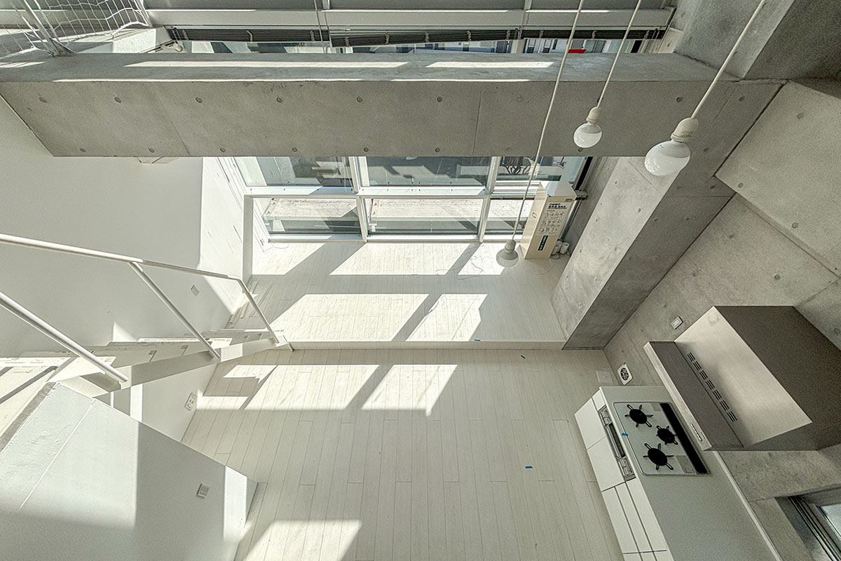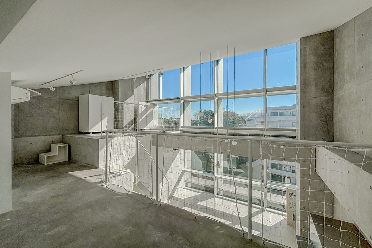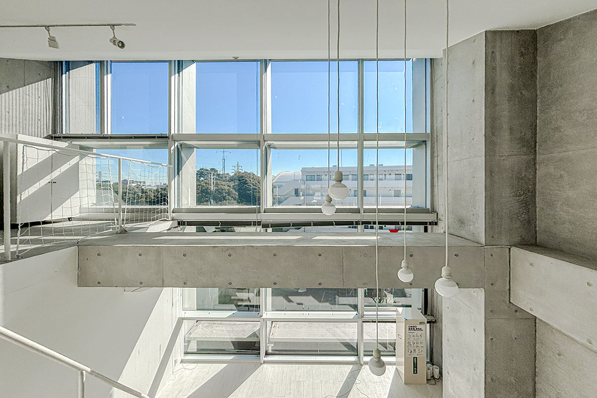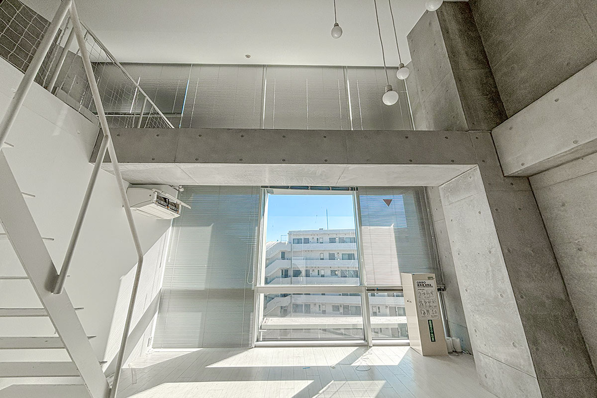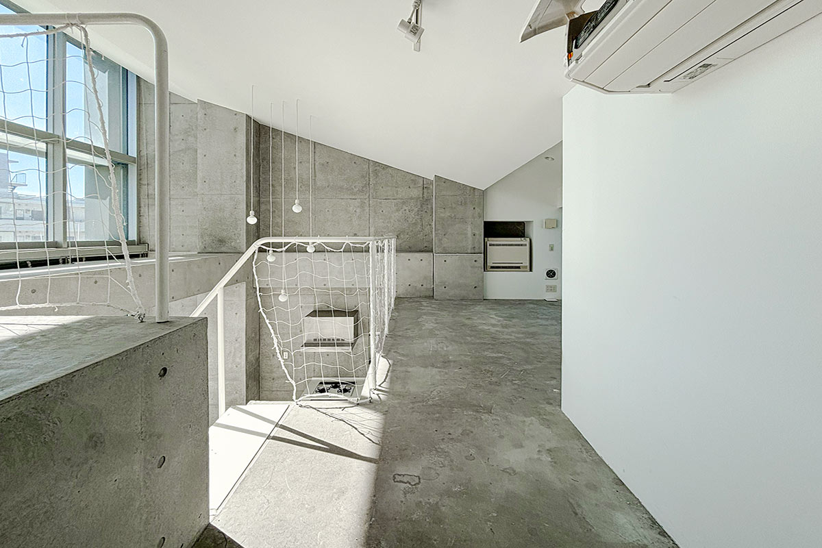 階段を上ると、吹き抜けが開放的なコンクリートフロアの上階。