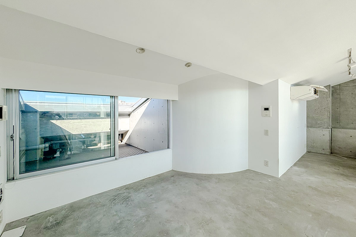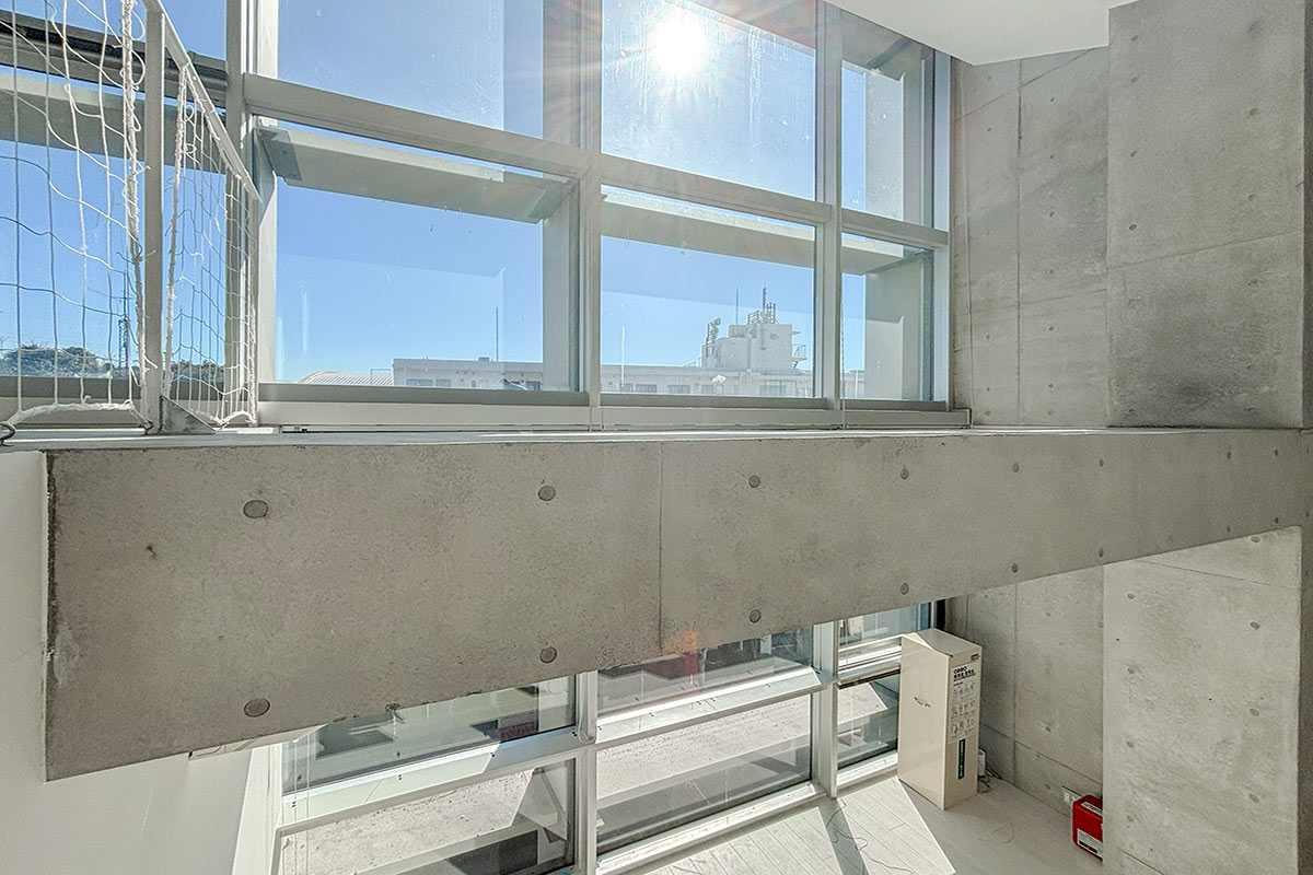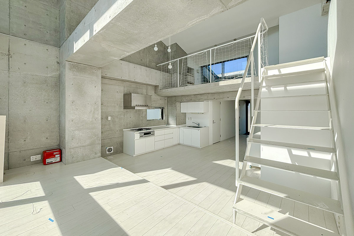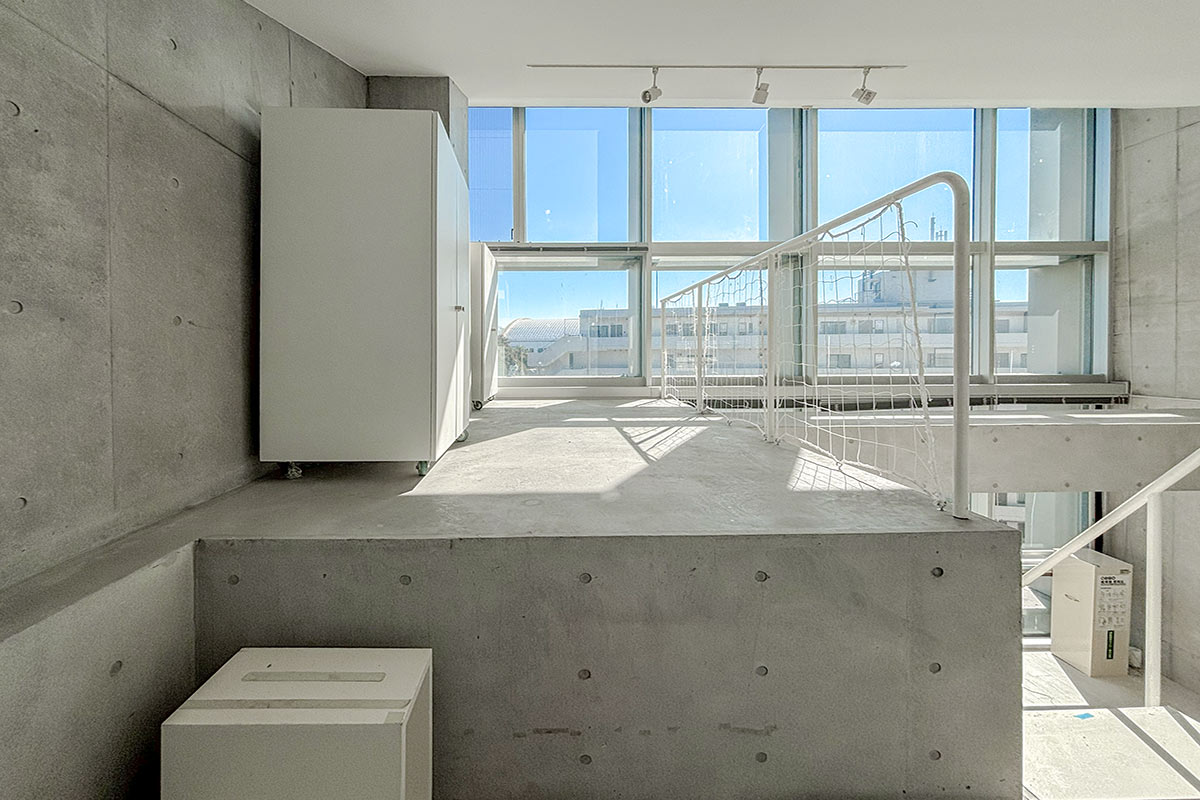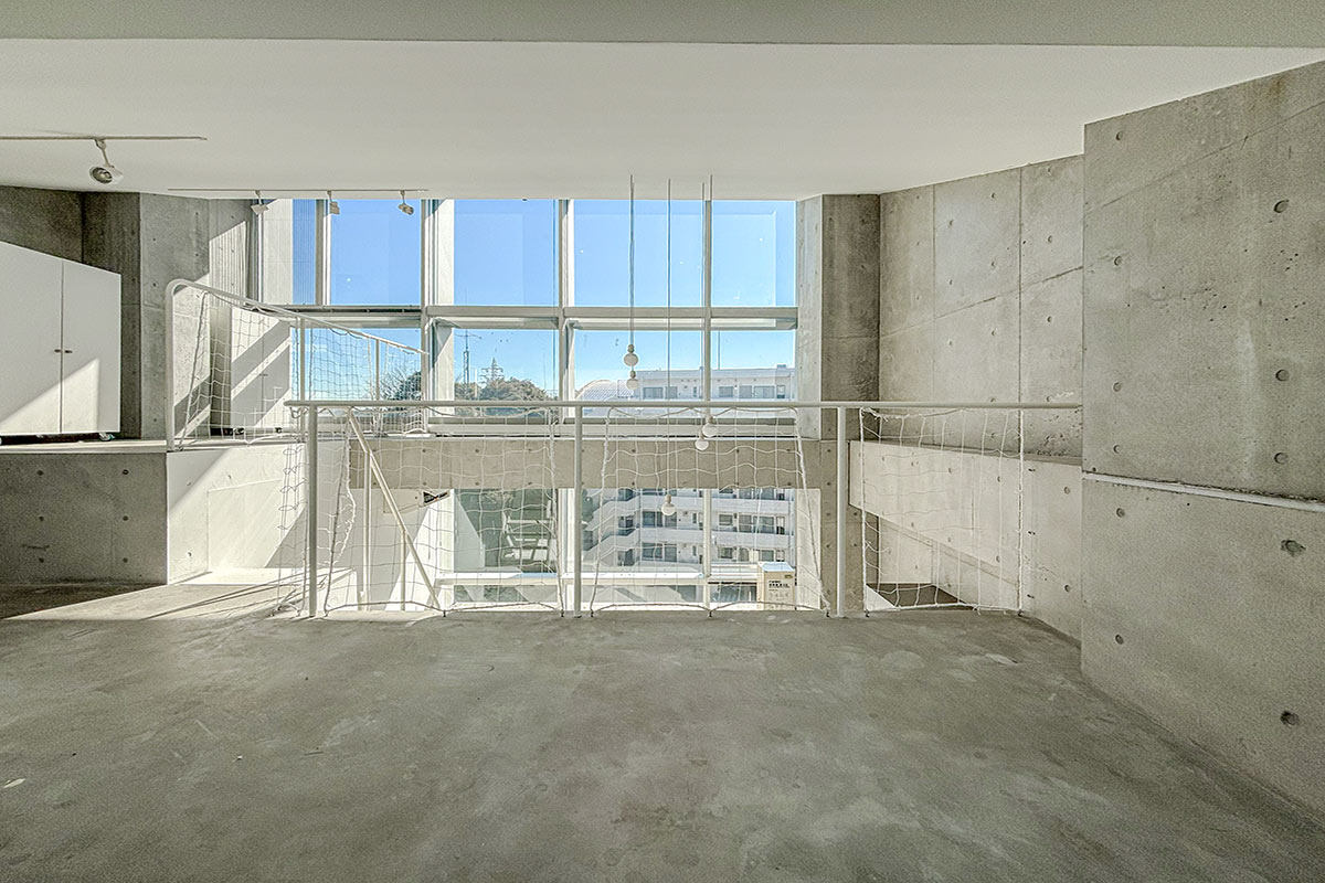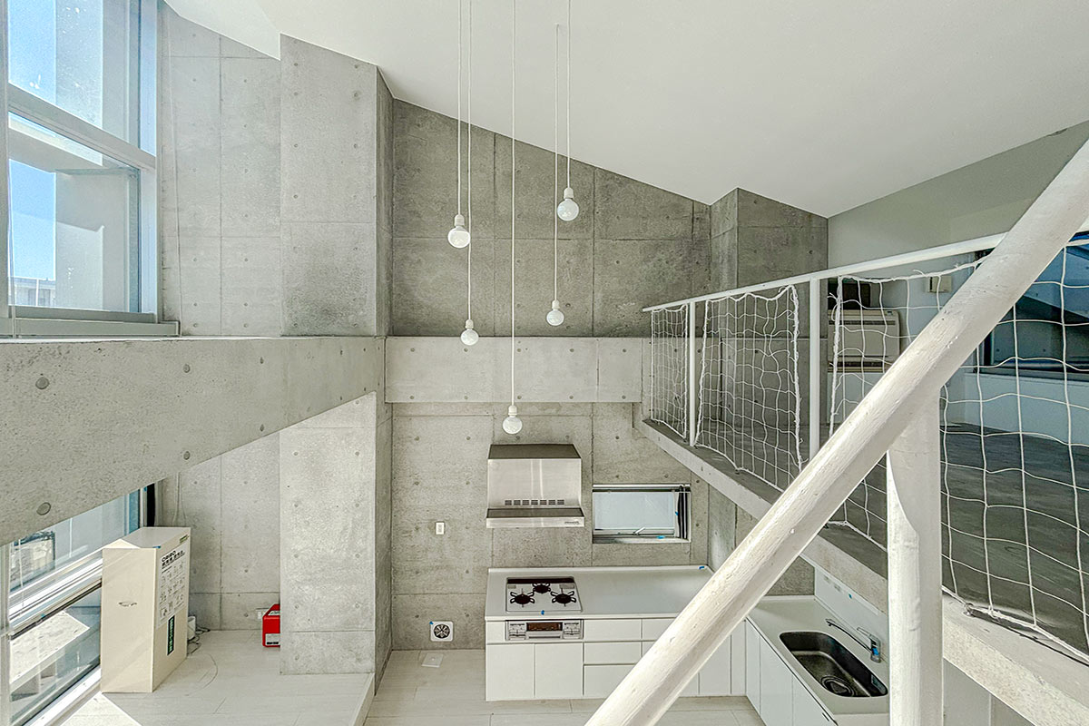 階段を上ると、吹き抜けが開放的なコンクリートフロアの上階。