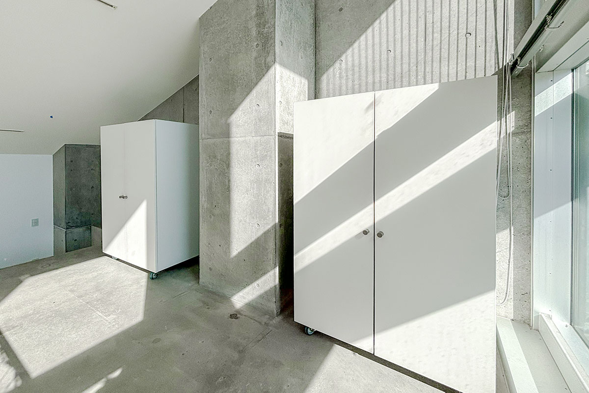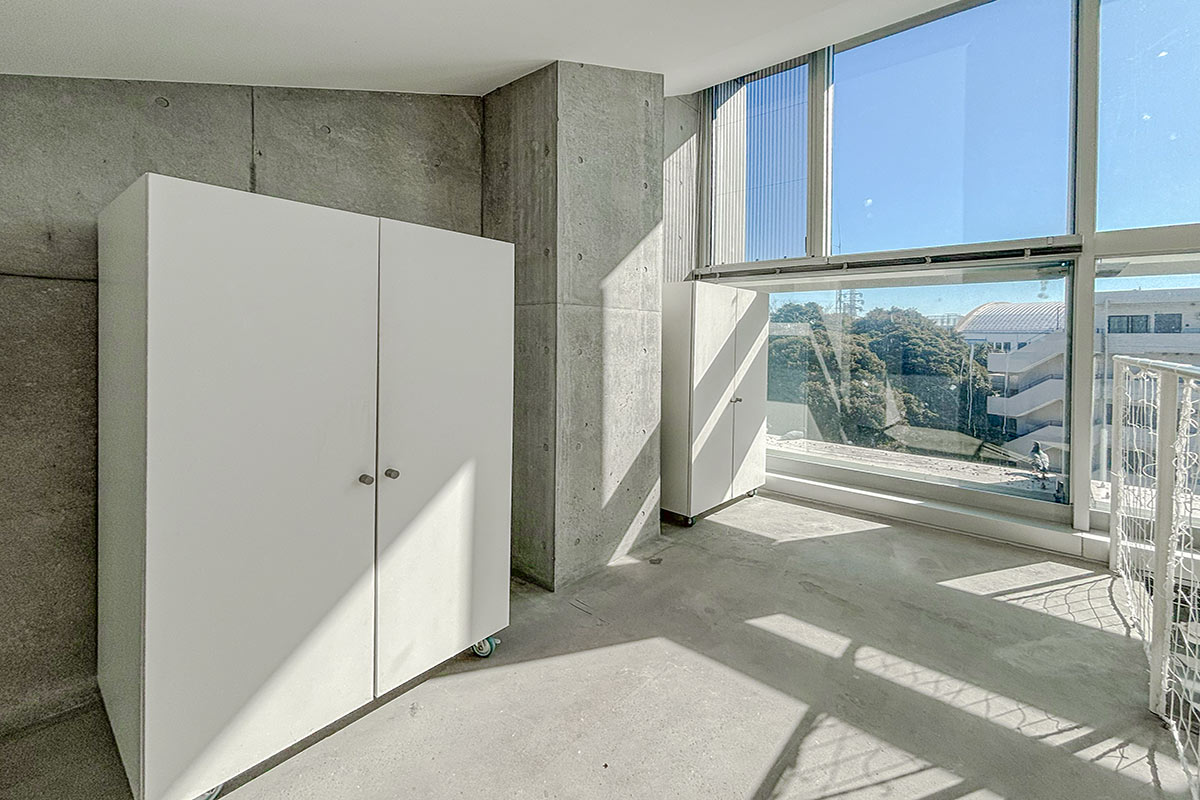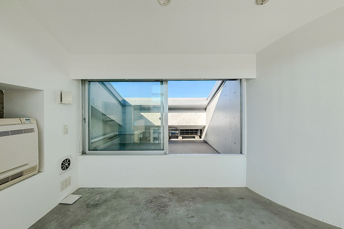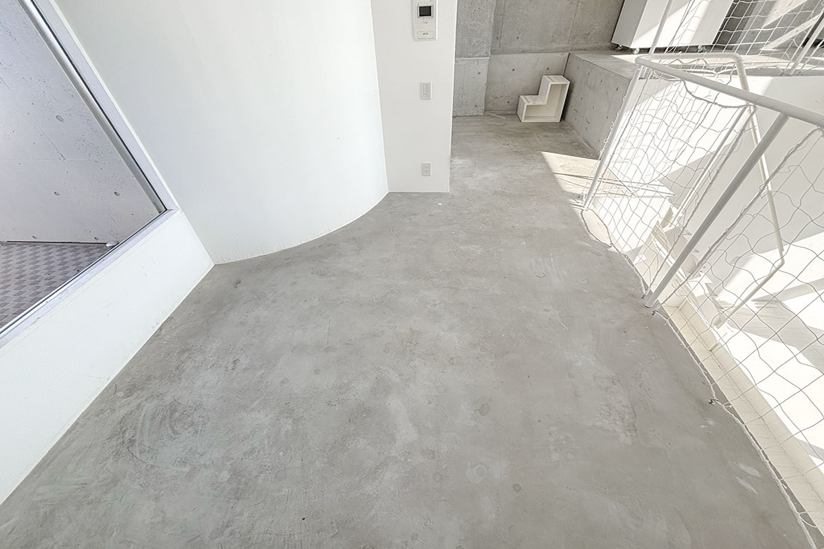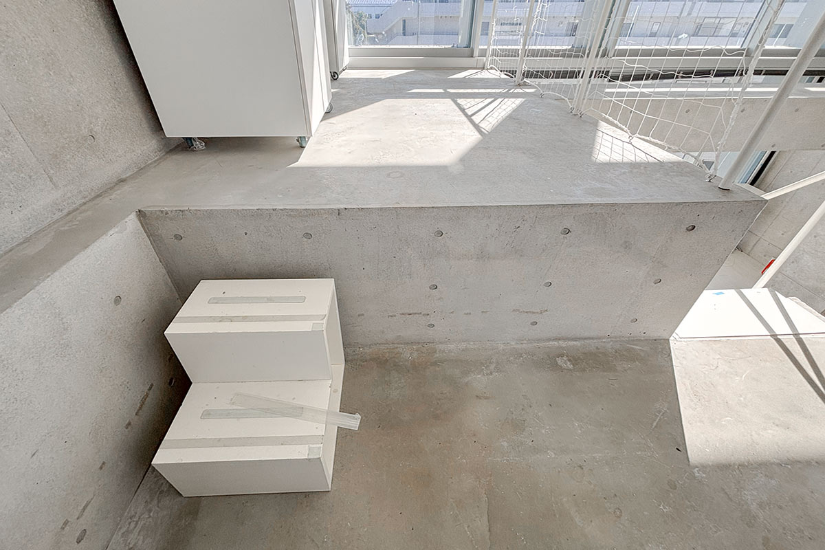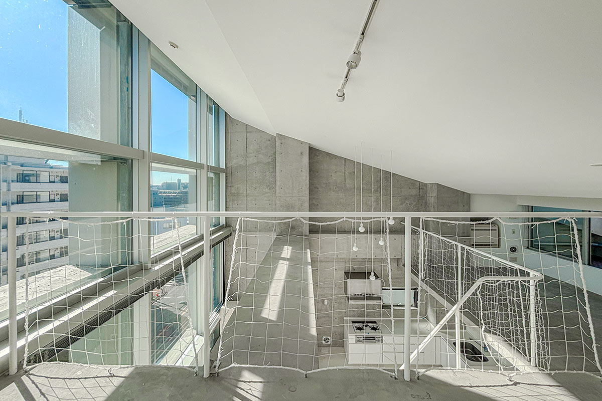 階段を上ると、吹き抜けが開放的なコンクリートフロアの上階。