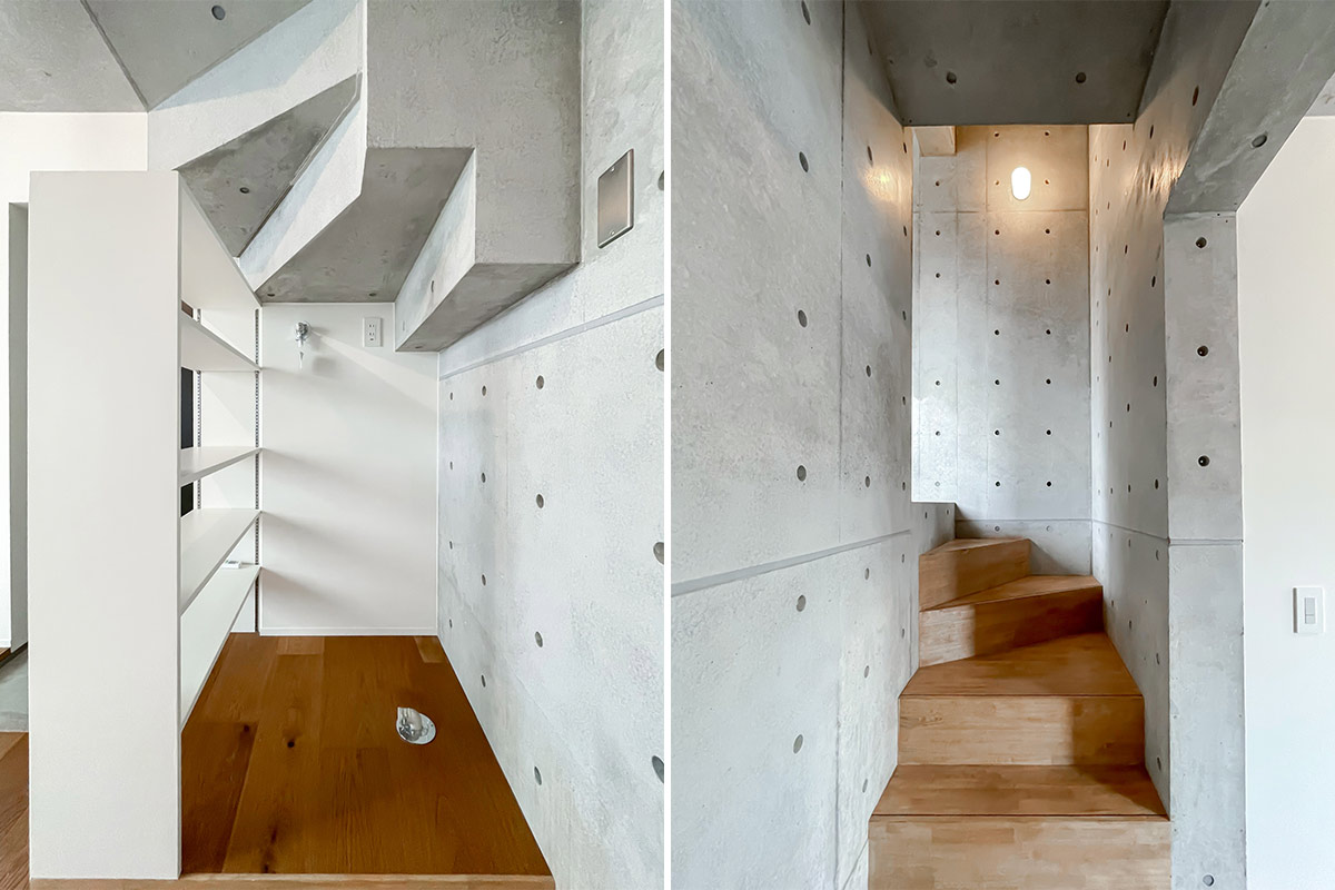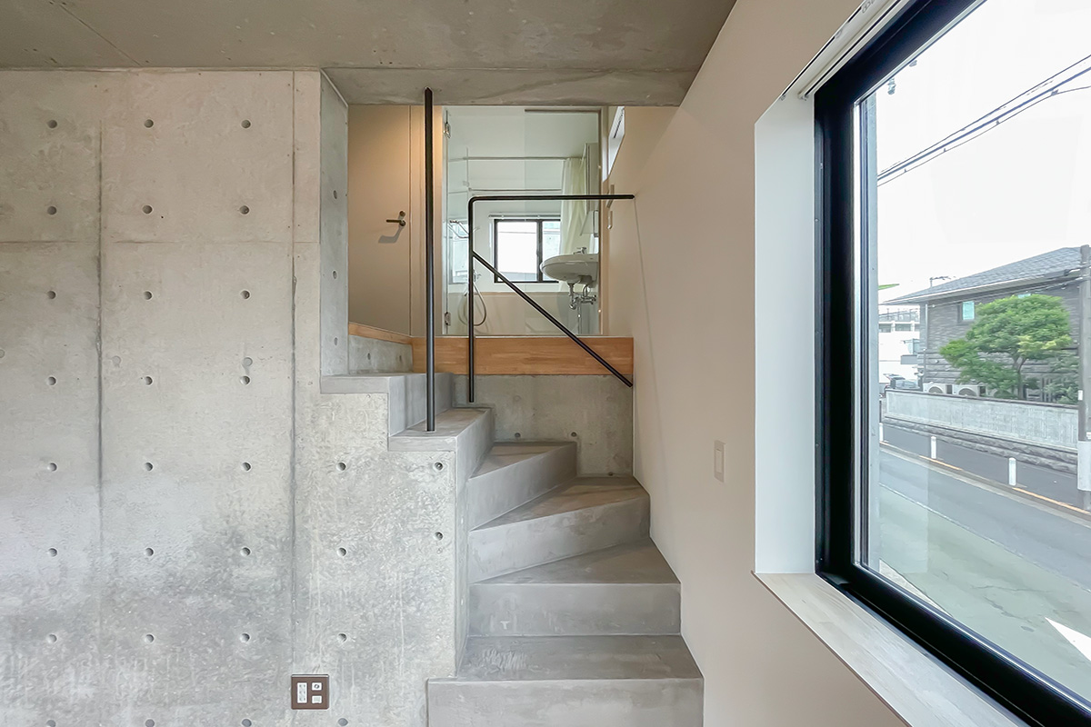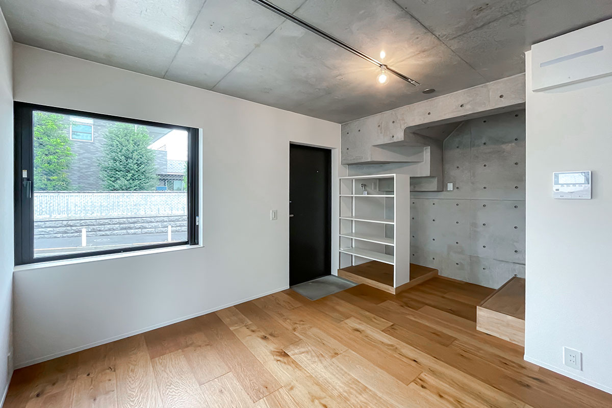 階段上がってすぐの窪みには、奥行き浅い収納ラックなら置けそうでしょうか。窓やガラス扉のおかげでこの空間も窮屈さ・暗さを感じることがありません。