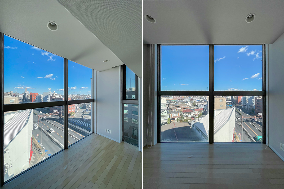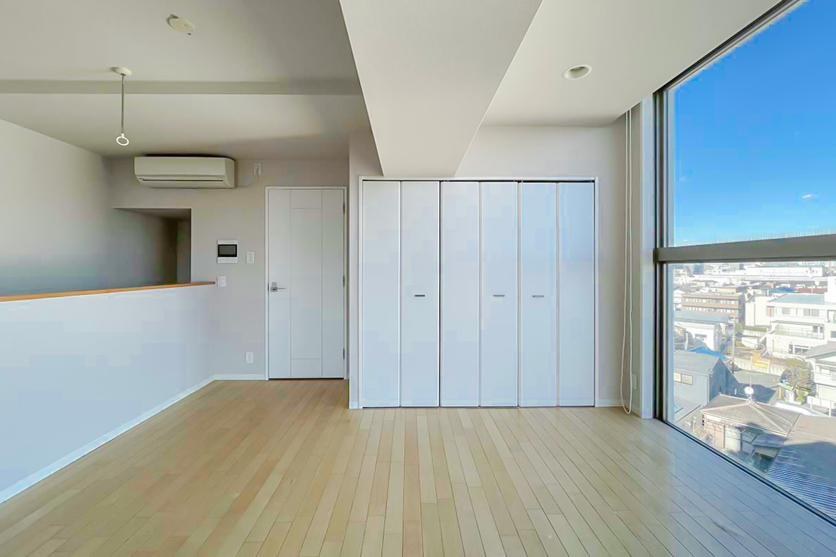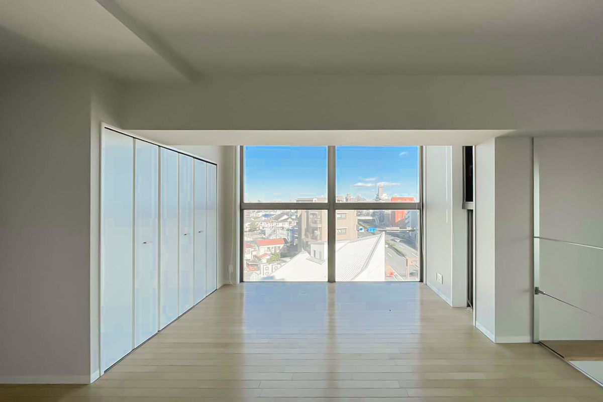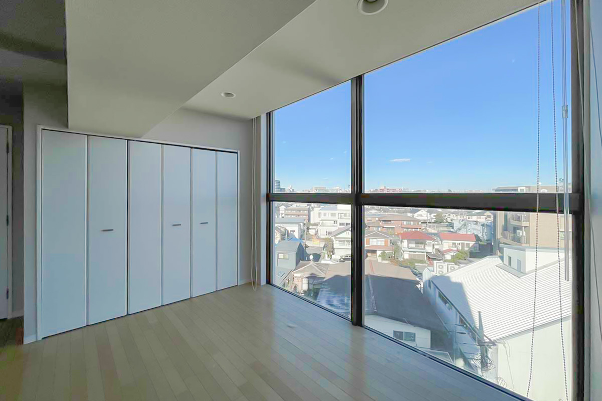7階の洋室は11.2帖の広さがあり、大きな窓から青い空を臨みます。