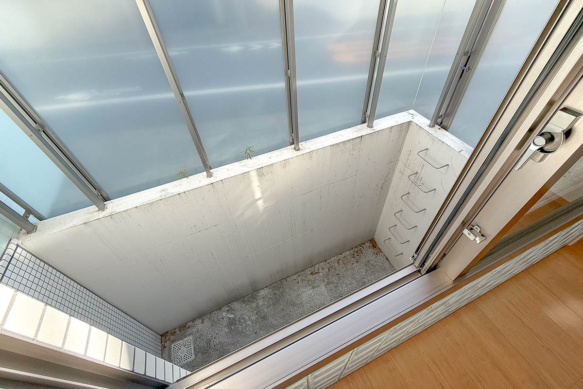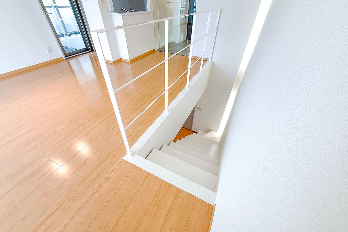 キッチン手前の扉を開けると、デッキが空中に浮かぶ吹き抜け空間。