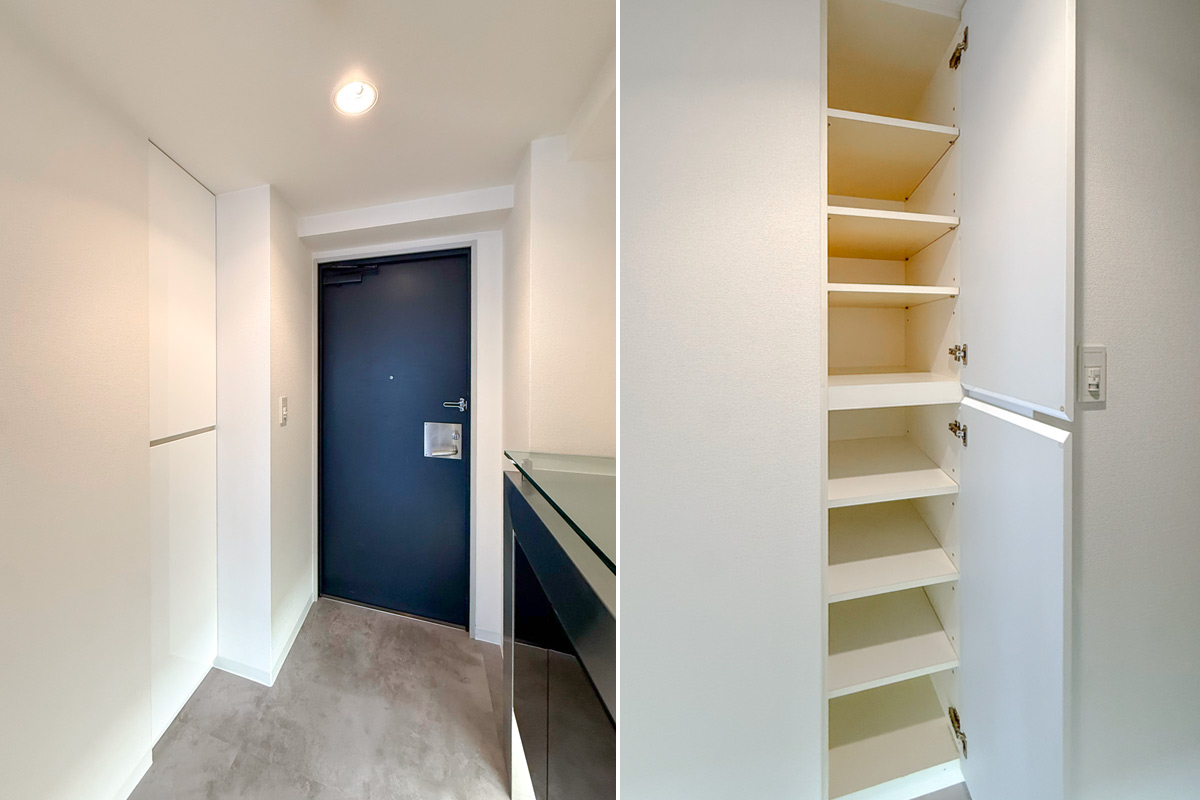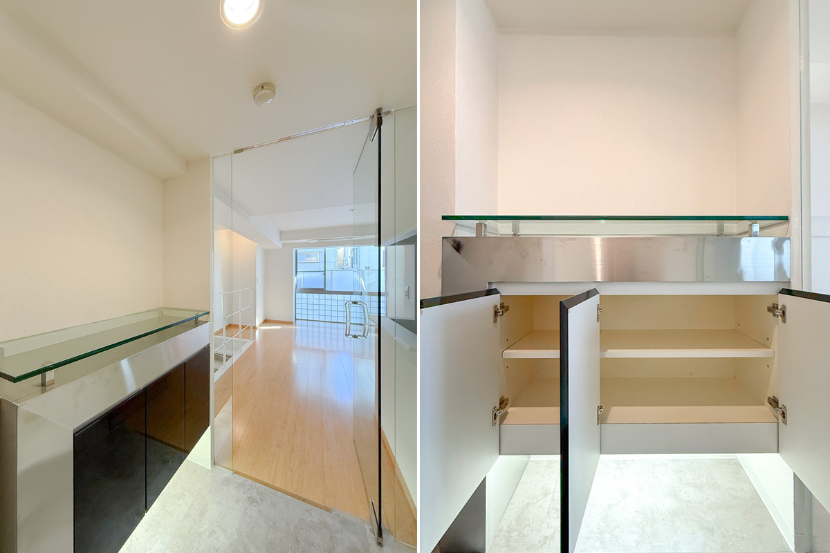扉や靴箱は美術館や博物館を思わせるデザインです。