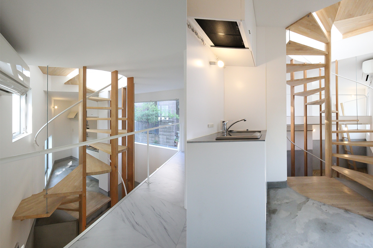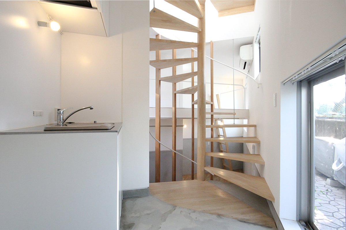 玄関はコンクリートの土間。そこにミニキッチンがあり、部屋の中央には螺旋階段。