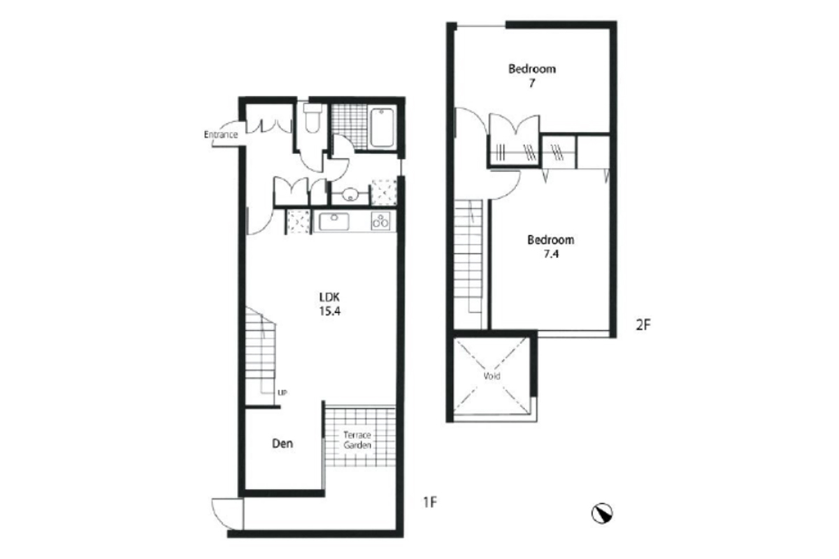 室内はメゾネット1-2階の2LDK+DEN+テラスガーデン。