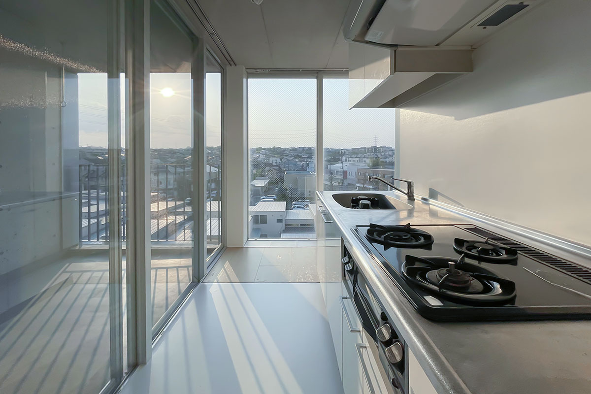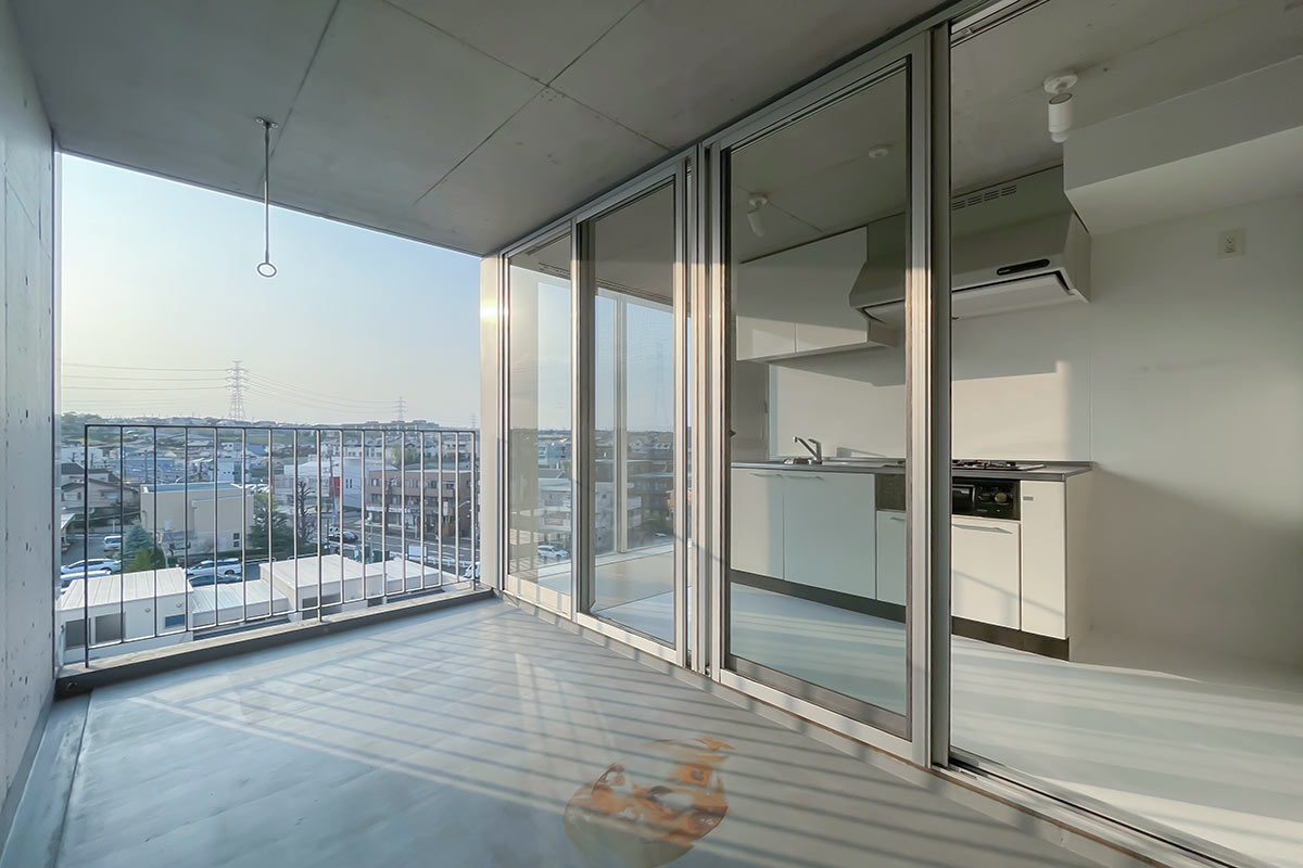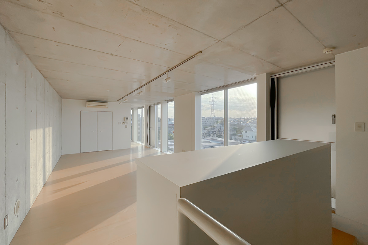 上階のLDKは規則的に並んだ縦窓が美しく、リビングからキッチンまで窓が続いており、続けて奥にはインナーバルコニー。視界が外の景色へ抜けることで、閉塞感を感じないすっきりとした空間に感じました。