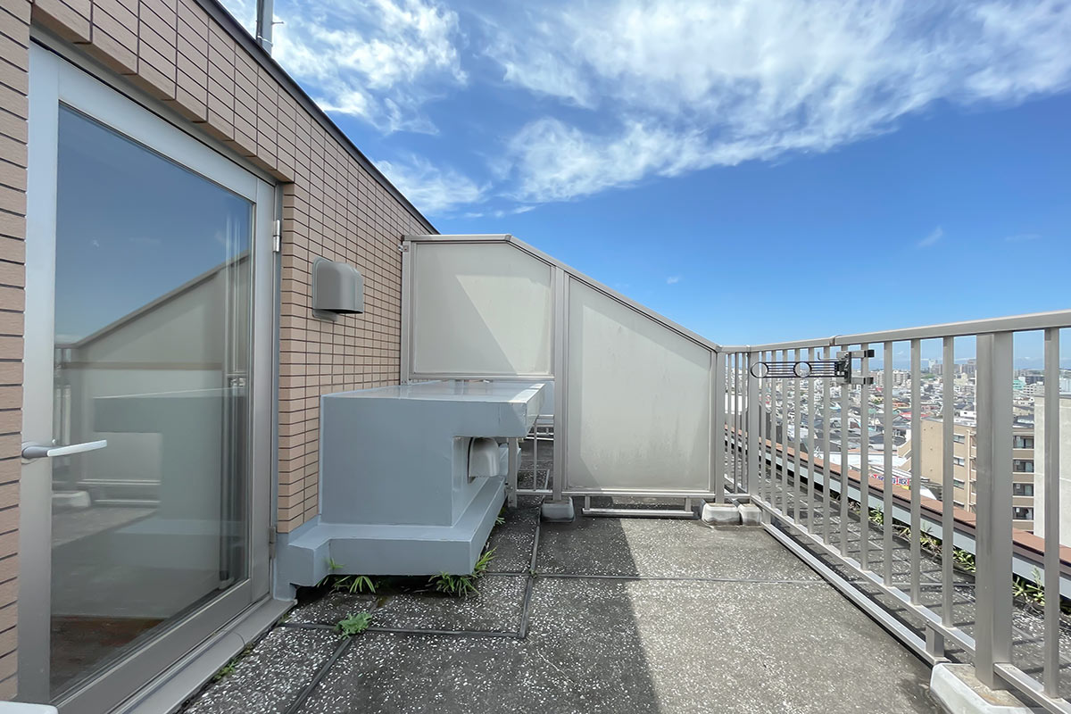 1層目のバルコニーは南向きの環七通り向き、陽当たりが良いので洗濯物はこちらに干すのがよいでしょうか。2層目のルーフバルコニーは北向きですが、マンション周辺は開けているため昼間であればこちらも陽当たり◎4帖ほどの広さがあるので、布団干しに使ったりちょっと一息つくには適度な広さでしょうか。