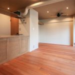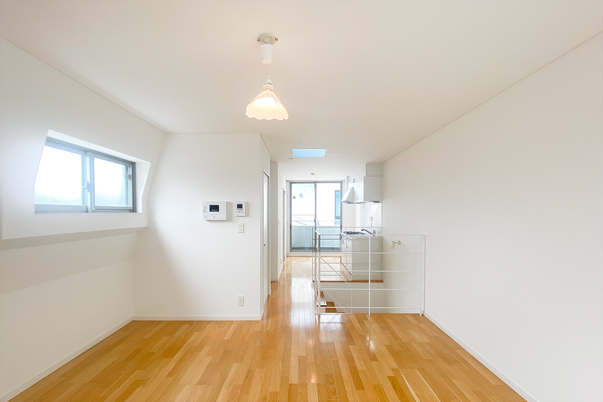 お部屋はメゾネットタイプの1LDK。1Fは2.6帖のキッチンをと15帖のLDK。