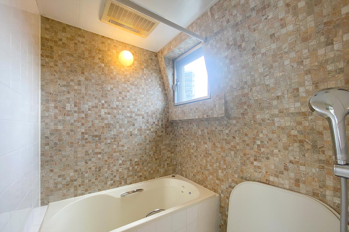 バスルームはモザイクタイルが非日常感を醸し出しなんともお洒落!