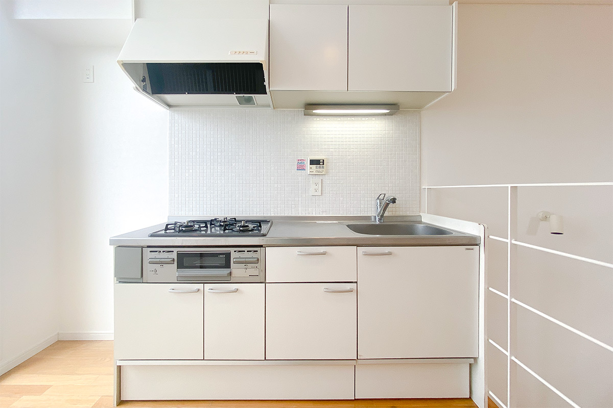 キッチンは2口ガスコンロ+グリル付き、収納も充実しており自炊の多い方にも申し分ないのでは。